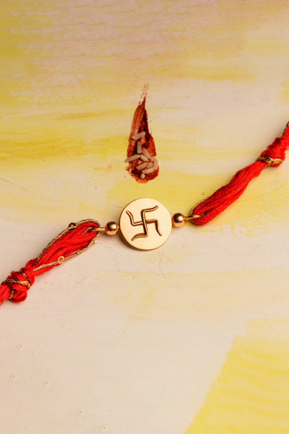 Suhani Pittie designs this occasion-ready rakhi for your brother crafted in 22kt gold finish enriched with a Swastika motif in a circular medallion featuring bead embellishments on red glitter threads.