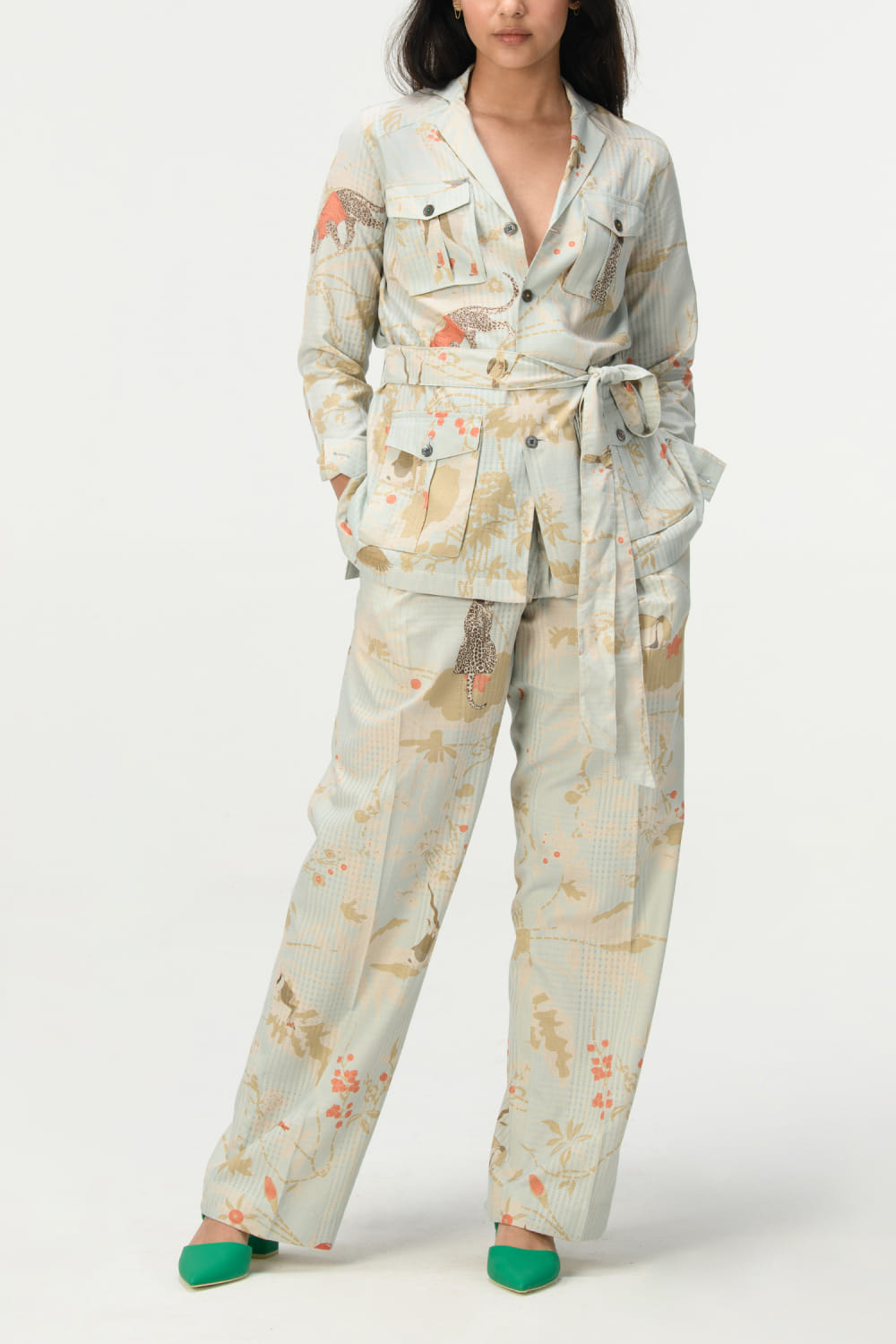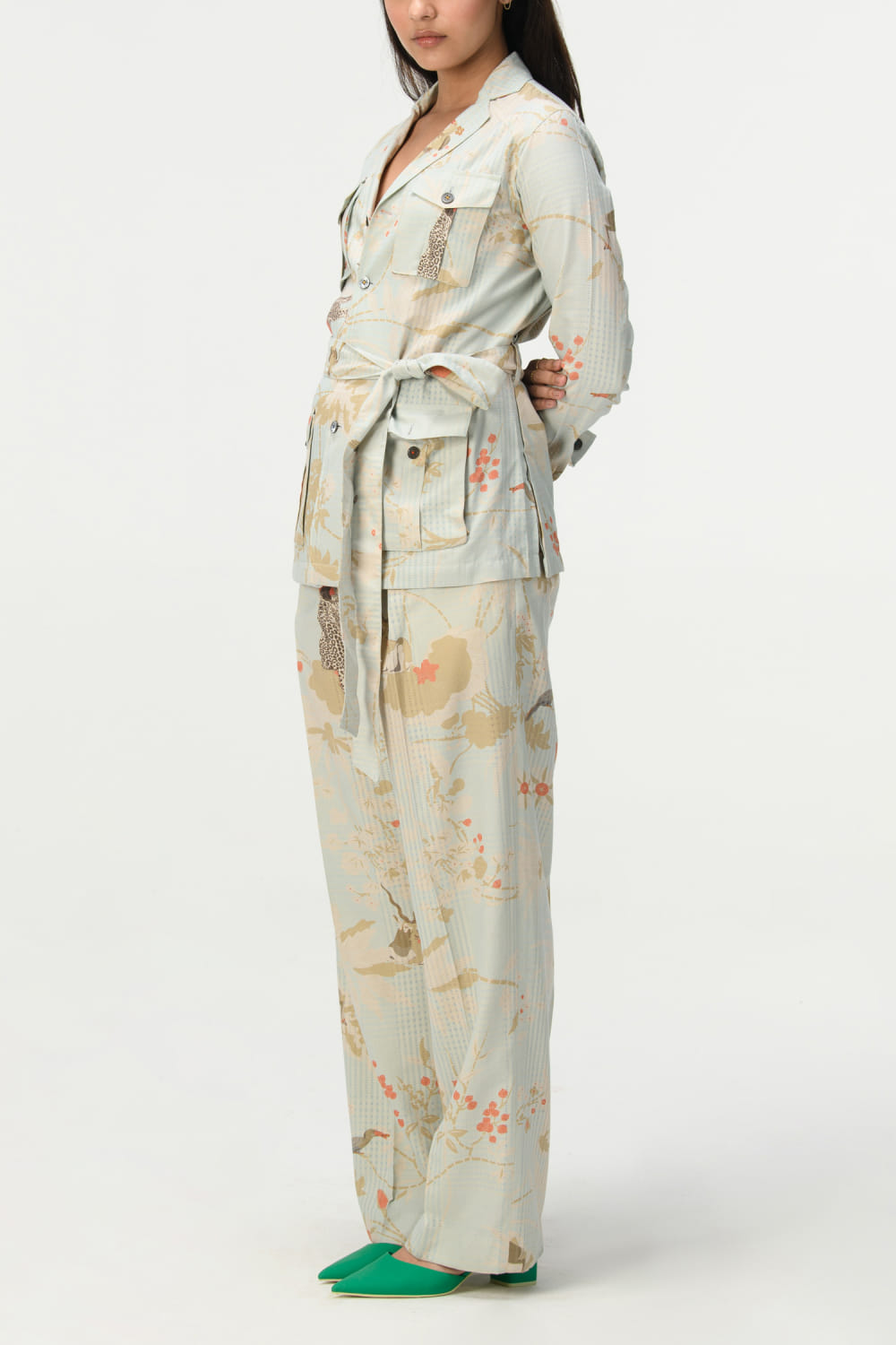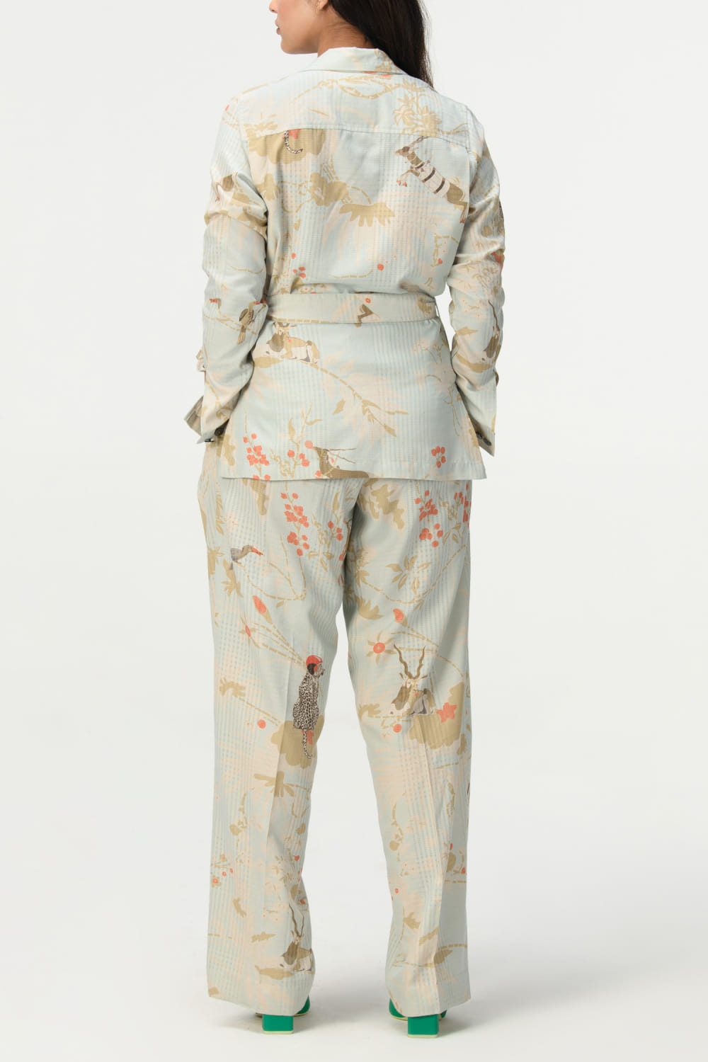 Suketdhir designs this contemporary pair of trousers customised in cotton silk check with single pleat detailing featuring rainforest print patterns. Style it with a short tunic for a vacation vibe. The jacket here is shown for styling purposes only.