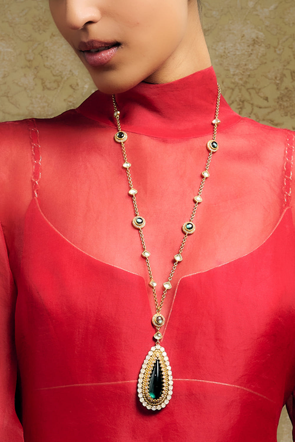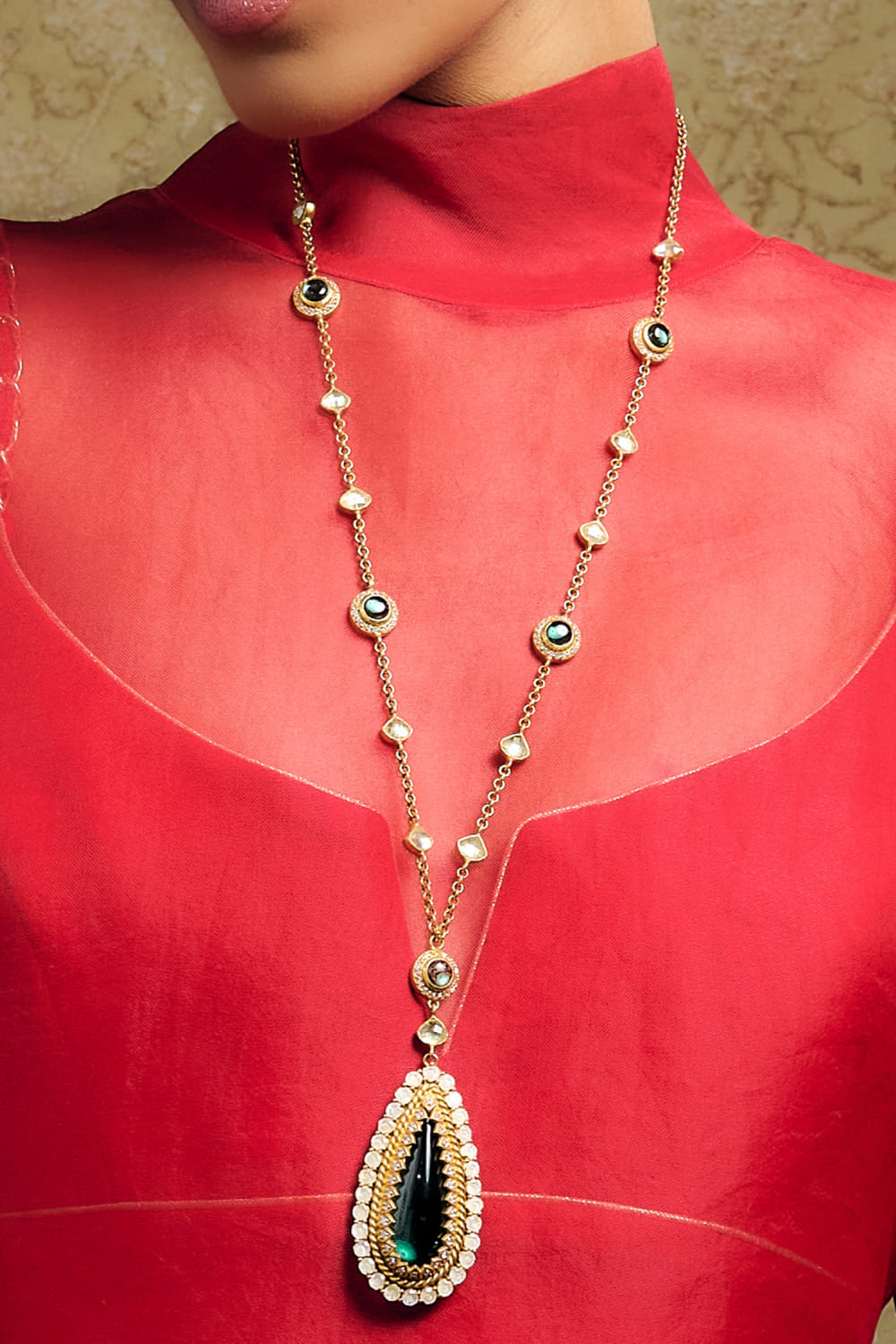 Tarun Tahiliani crafts this eye-catching long chain pendant necklace detailed with emerald glass stone, rose-cut zircon, and cabochon embellishments. It is crafted in 92.5 sterling silver and finished with 24K gold dipped polish. Style the set with an embellished gown for the gala night.