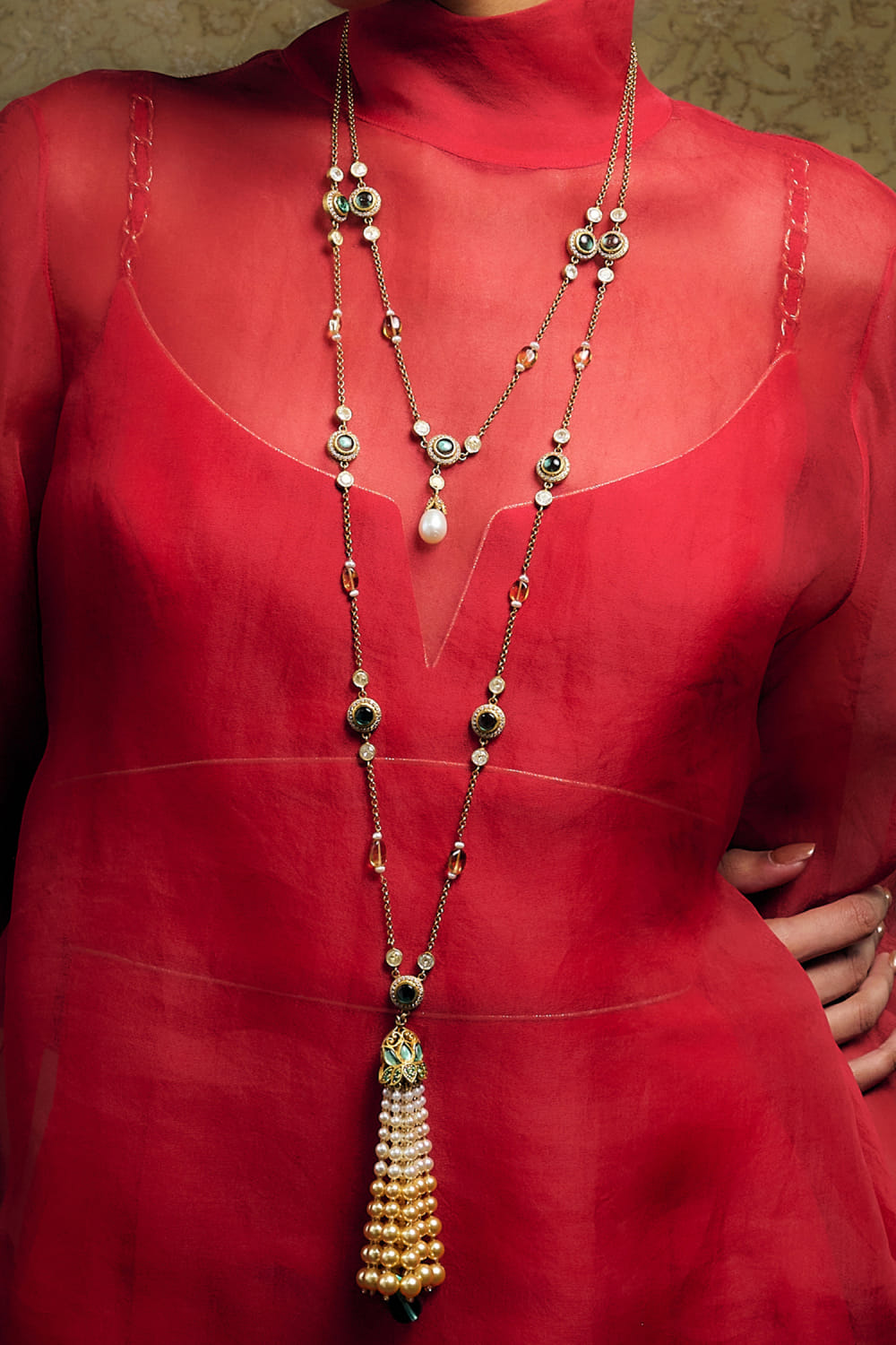 Tarun Tahiliani designs this charming layered chain necklace embellished with citrine, emerald glass stone, rose-cut zircon, and cabochon and tassel accent detailing. It is crafted in 92.5 sterling silver and finished with 24K gold dipped polish. Style it with a kaftan ensemble for a classy vibe.