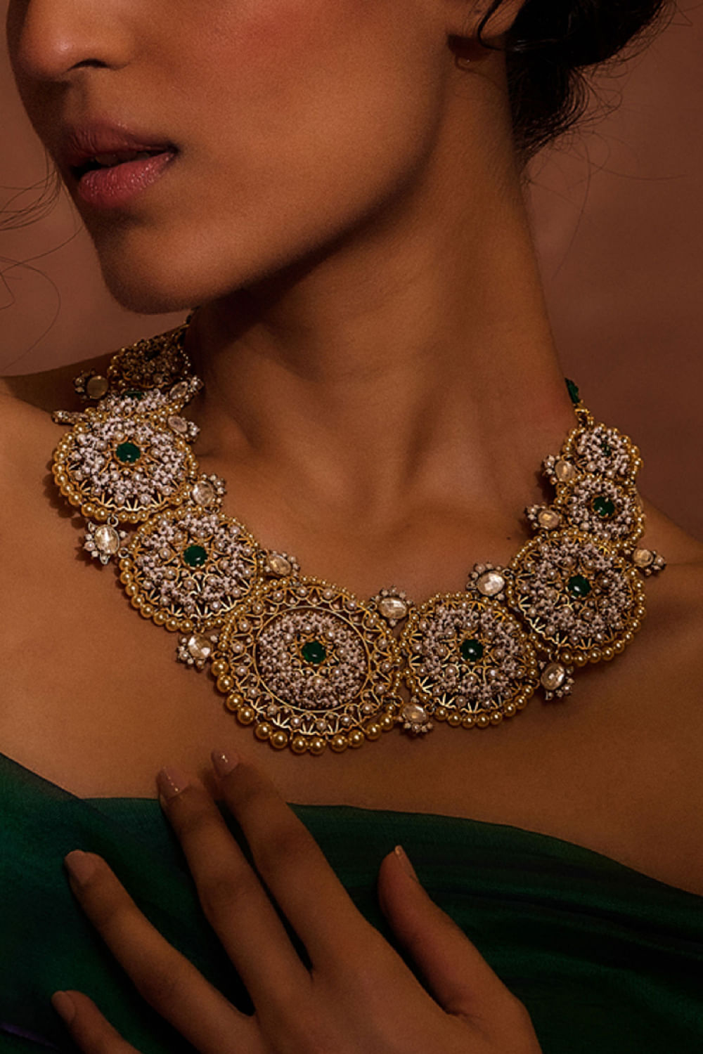 Tarun Tahiliani designs this dazzling necklace customised in 24kt gold-plated 92.5 sterling silver laden with freshwater pearls, green onyx and zircon embellishments. Style it with an embroidered sari for a wedding function.