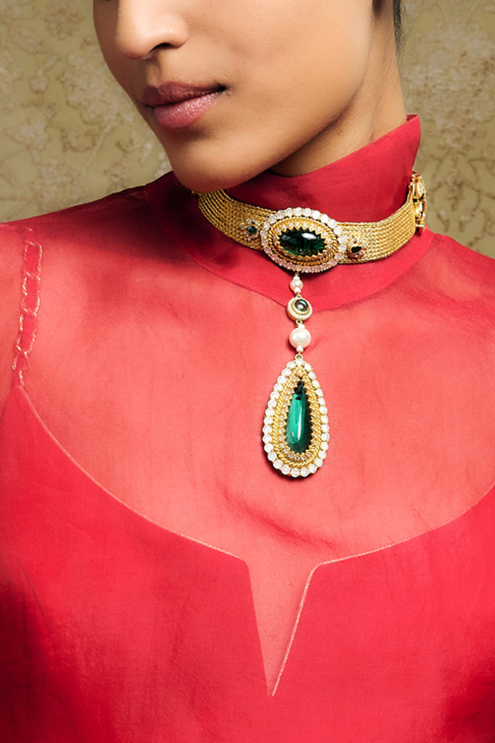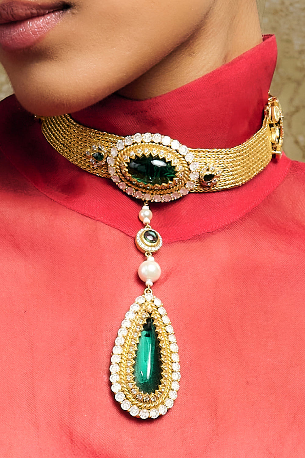 Tarun Tahiliani crafts this glistening drop pendant choker enhanced with emerald glass stone, rose-cut zircon, and cabochon studded on an intricate mesh chain. It is crafted in 92.5 sterling silver and finished with 24K gold dipped polish. Style the set with an opulent lehenga ensemble for a cocktail party.
