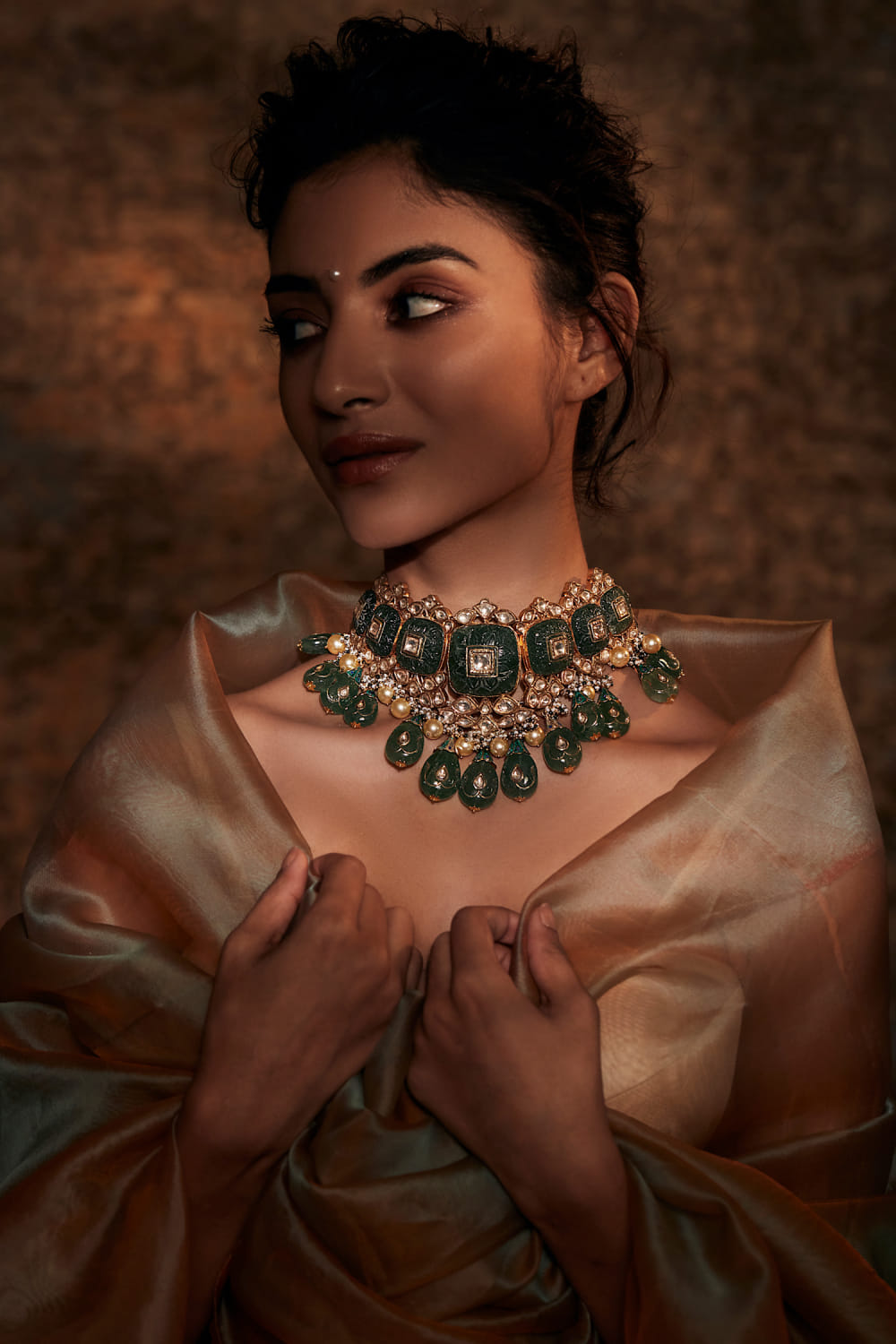 Tarun Tahiliani designs this treasure-worthy choker in silver with gold plating, featuring aventurine stones, hand-cut glass stones, and Swarovski pearls. Style the look with a kanjeevaram sari for a wedding.