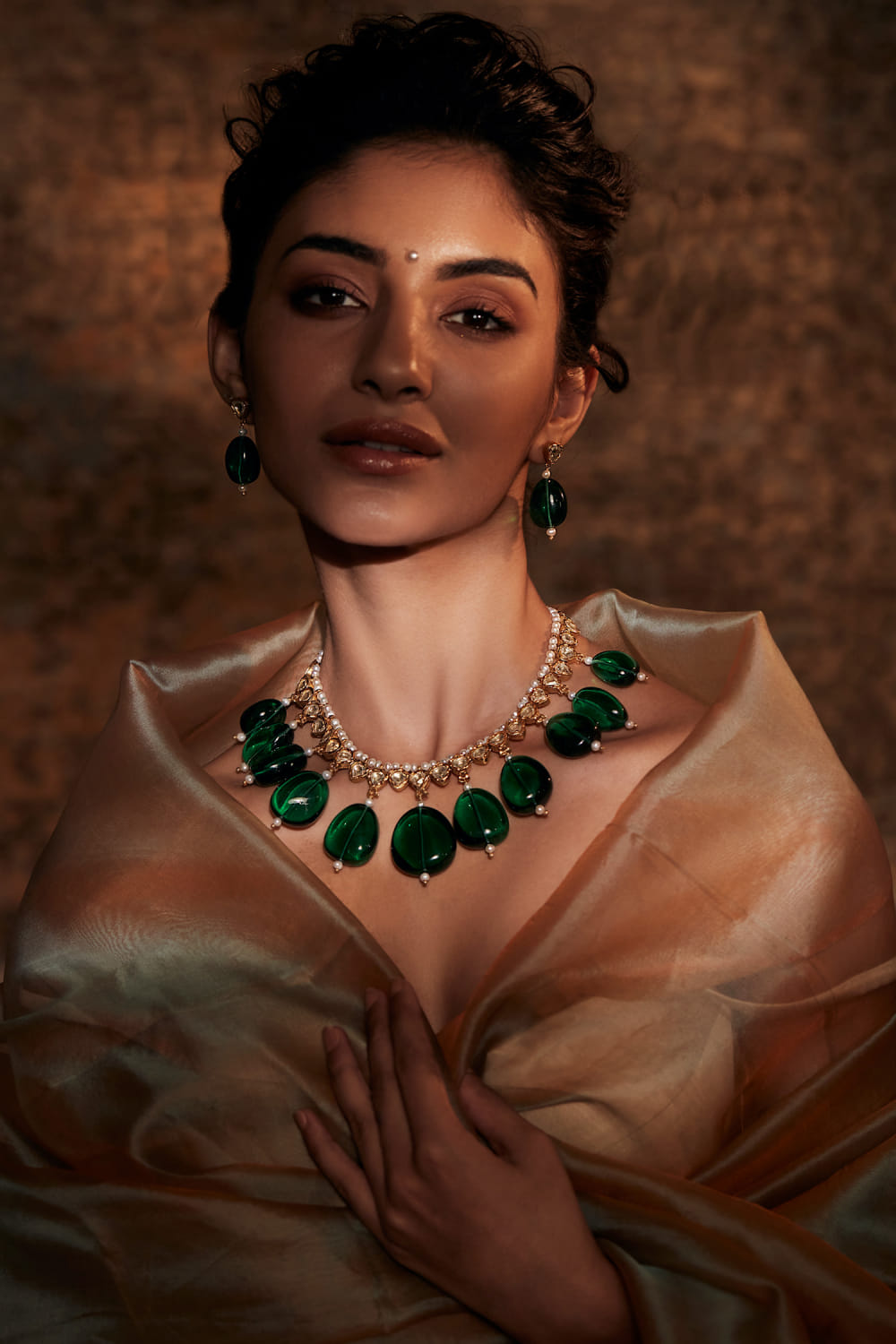 Tarun Tahiliani designs this new-age necklace in silver with gold plating, featuring ruby-coloured hand-cut glass stones and freshwater pearls. Style it with a regal bridal ensemble.The earrings here are shown for styling purposes only.