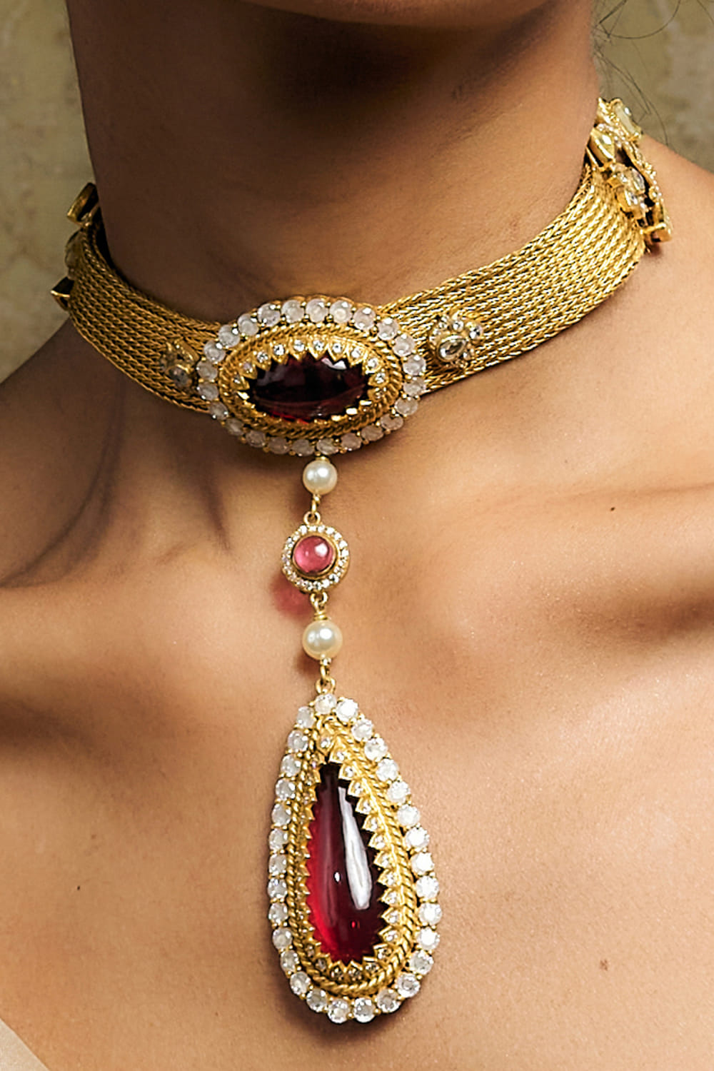 Tarun Tahiliani designs this glamorous choker in 92.5 sterling silver with 24kt gold plating, studded with rose-cut zircons, Swarovski pearls and cabochon glass bead detailing. Style it with a banarasi sari set for a festive celebration.