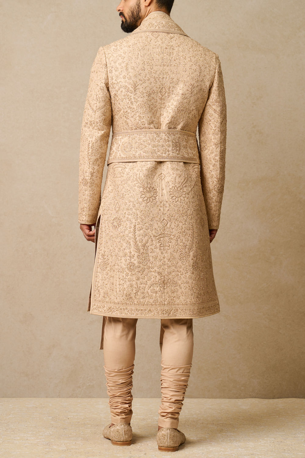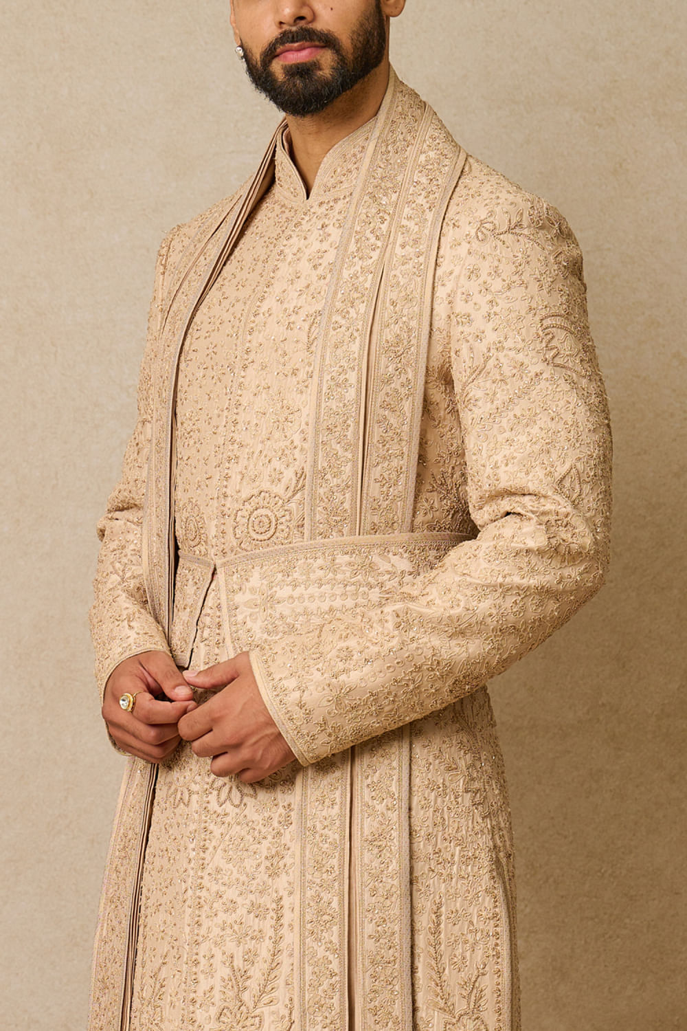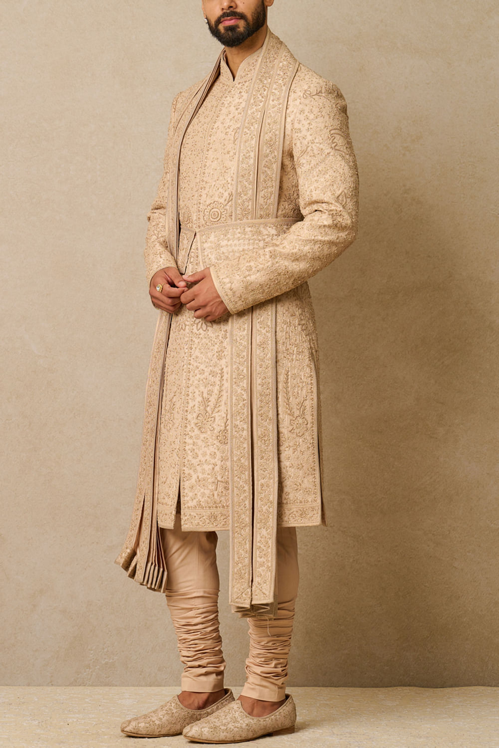 Tarun Tahiliani designs this sophisticated traditional sherwani in dupion silk enriched with French knot, dori and aari embroidery in intricate floral patterns, paired with a kurta, matching churidar, matching pre-pleated stole, matching kamarbandh, safa and jutti fabric. Style the look with a beaded necklace and kalangi for the quintessential groom look. The juttis here are shown for styling purposes only.