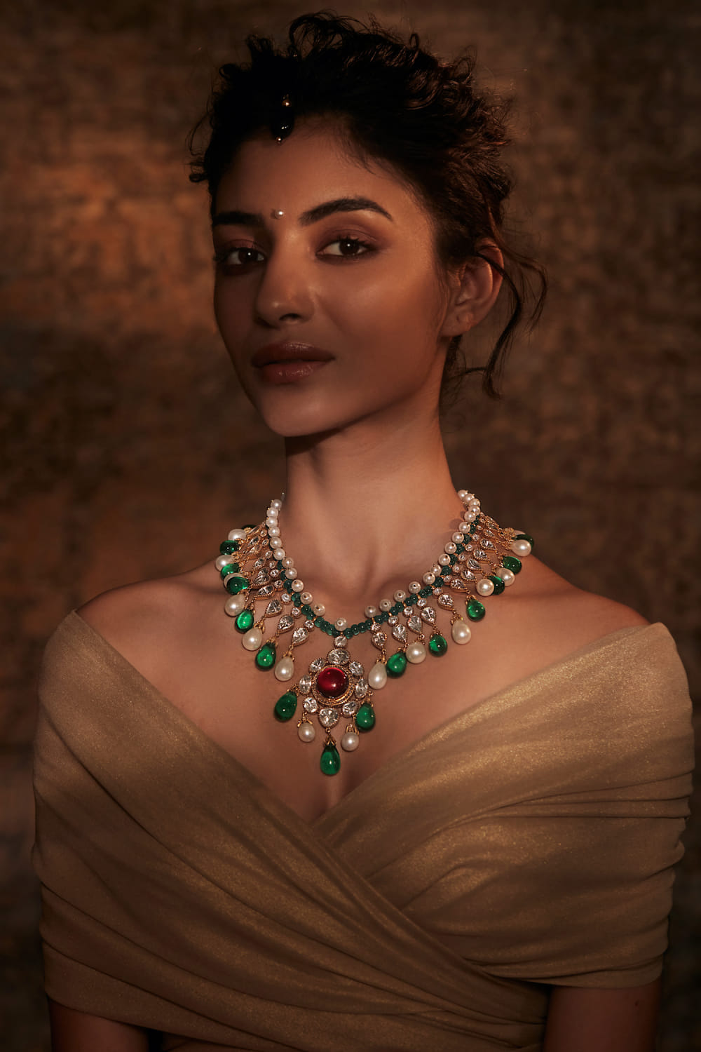 Tarun Tahiliani designs this opulent necklace in silver with gold plating, featuring green-coloured hand-cut glass stones and freshwater pearls. Style the masterpiece with a contemporary lehenga set.