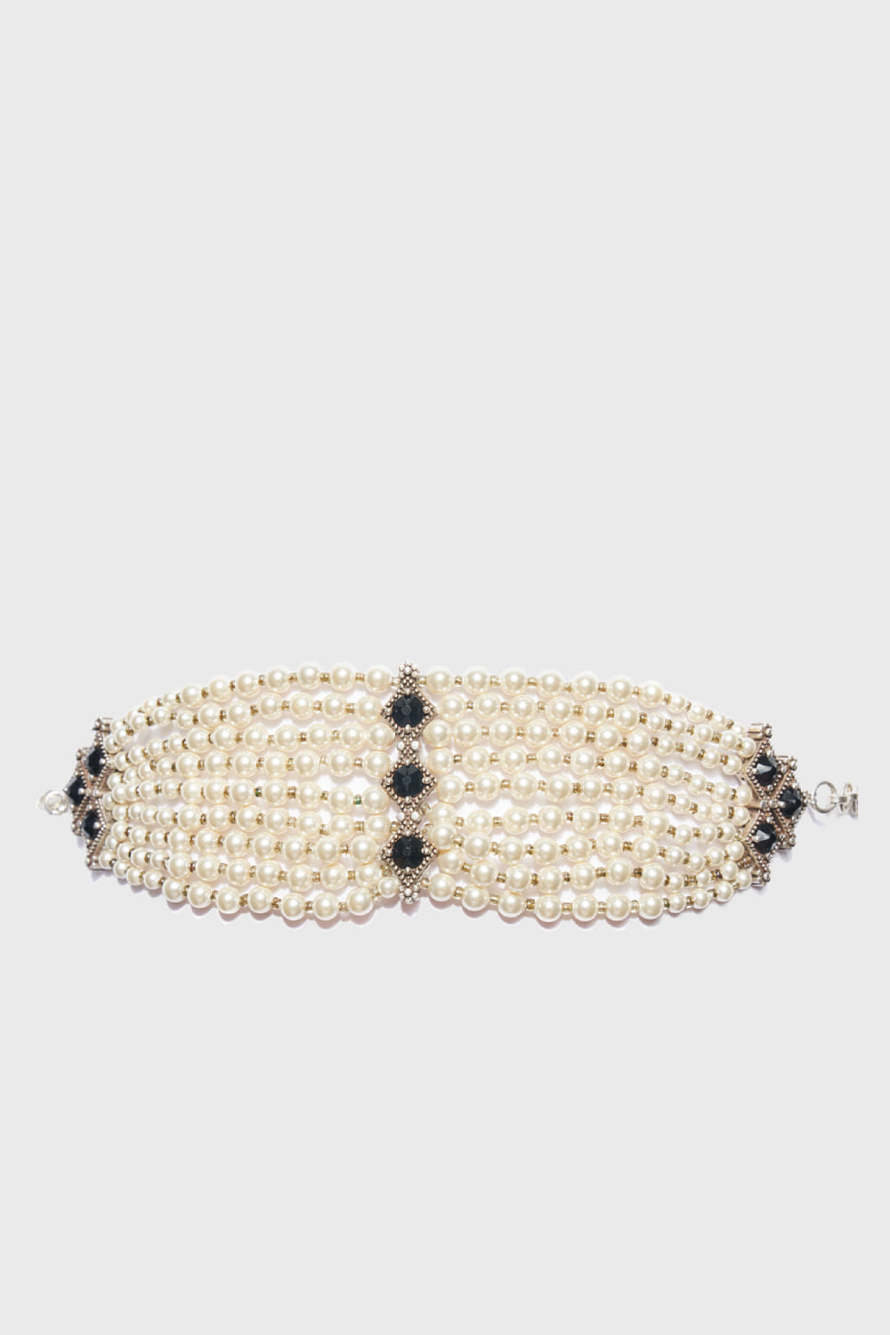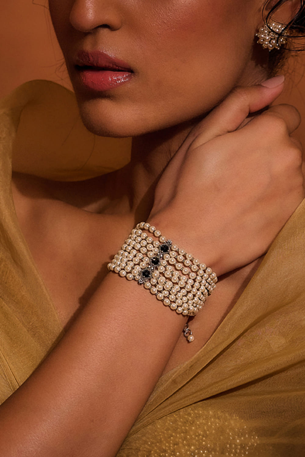 Tarun Tahiliani designs this ethereal bracelet crafted in gold-plated 92.5 sterling silver embedded with freshwater and Swarovski pearls, poth beads and zircon embellishments. Style them with a chikankari embroidered sari set for a distinctive look.