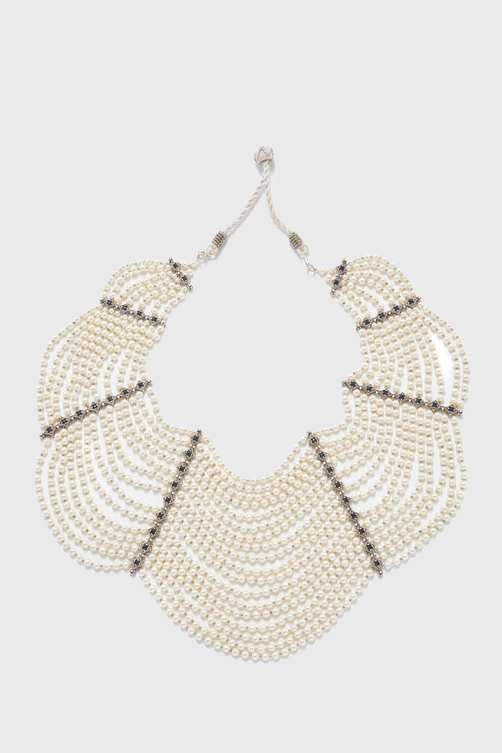 Tarun Tahiliani designs this lustrous necklace crafted in gold-plated 92.5 sterling silver embedded with strings of Swarovski pearls, beads and zircon embellishments. Style it with a belted sari to make a statement.