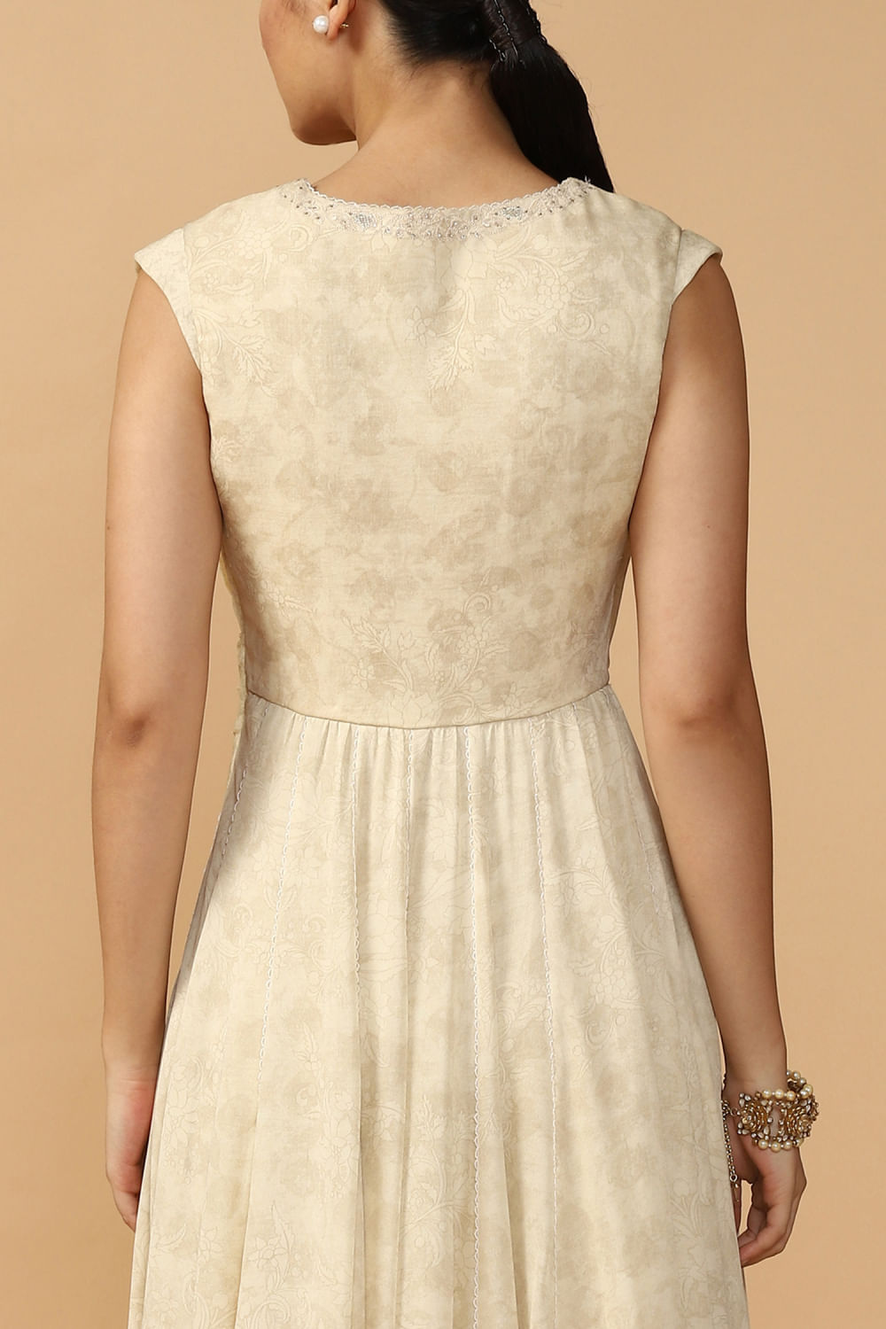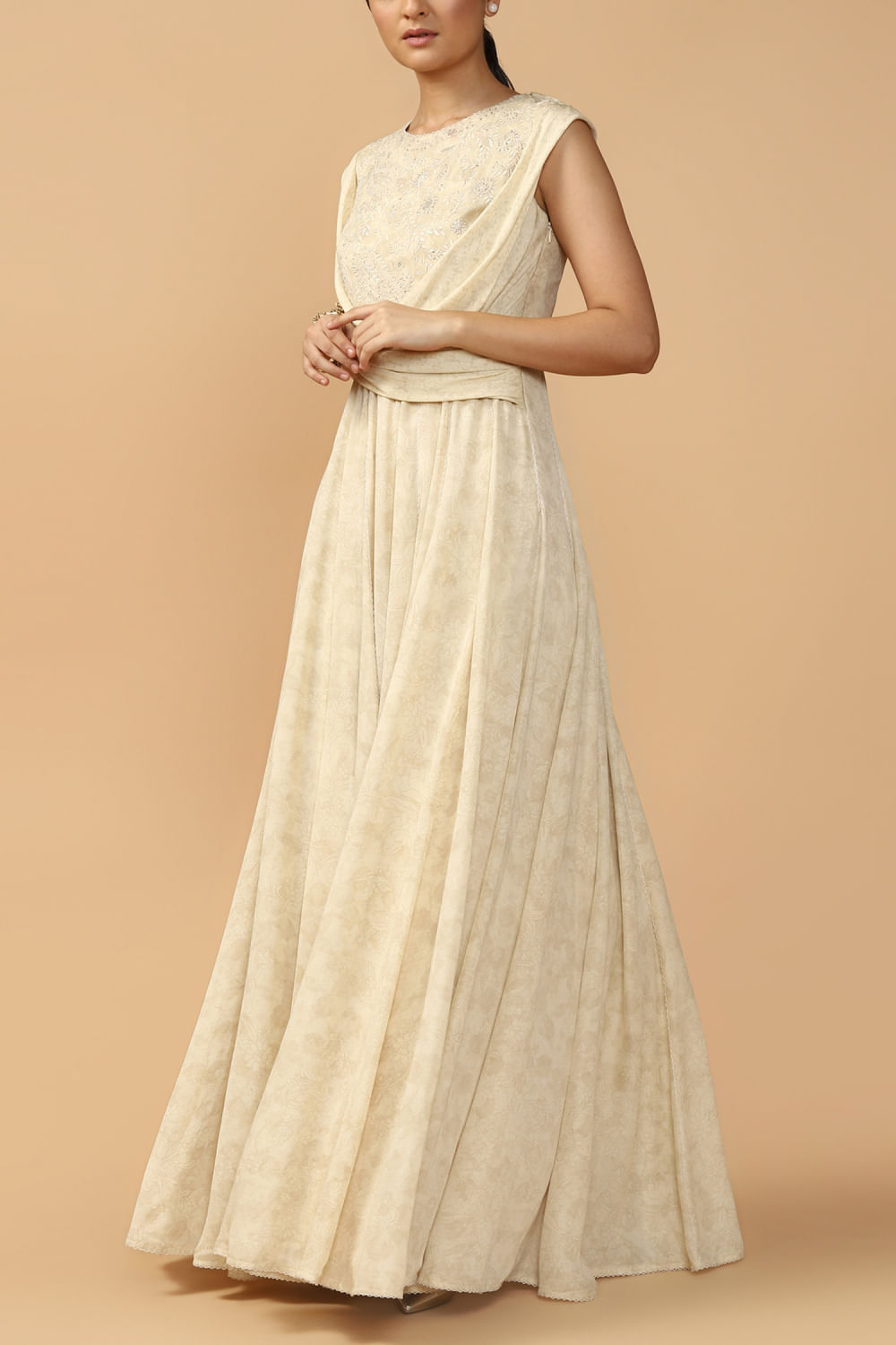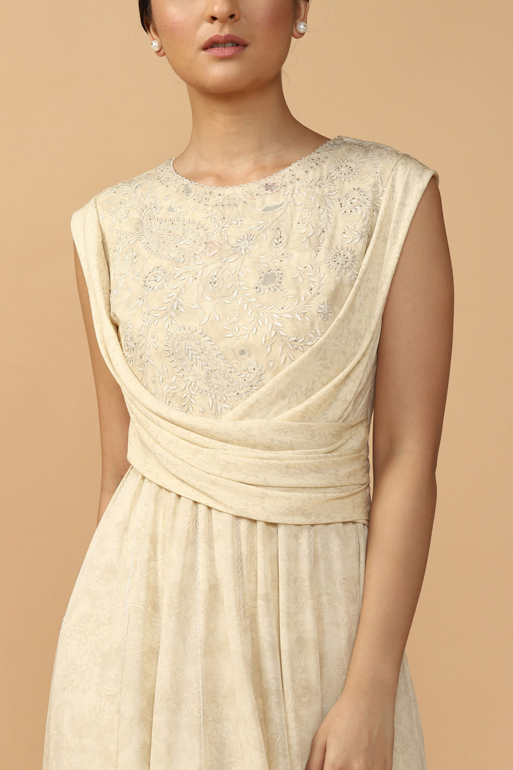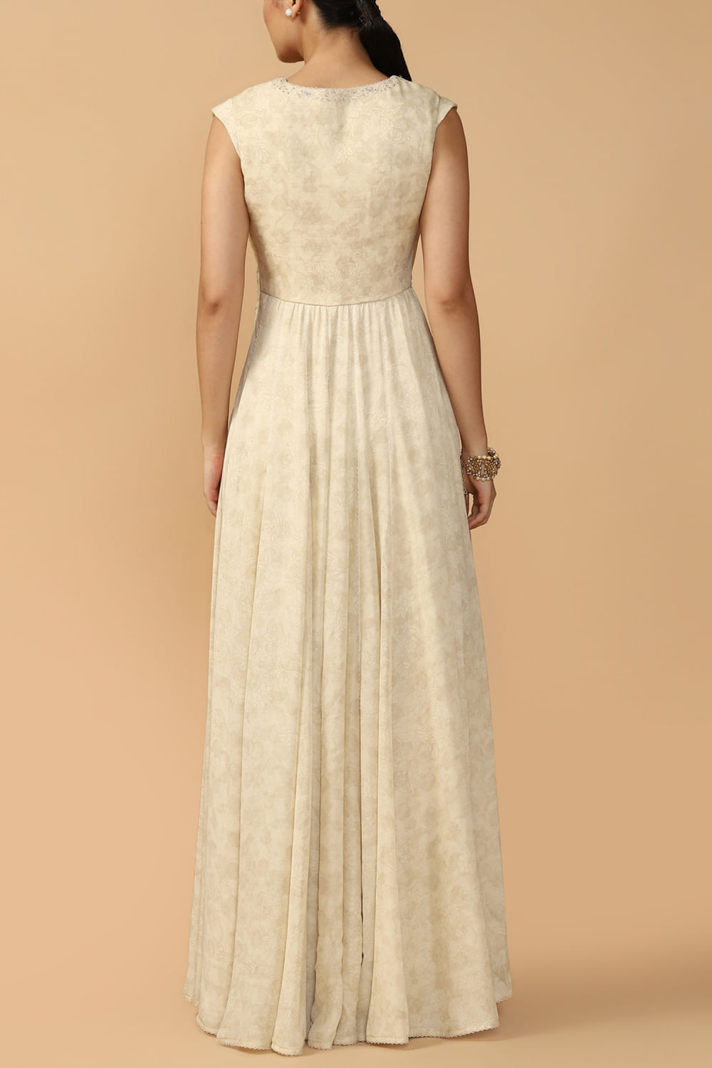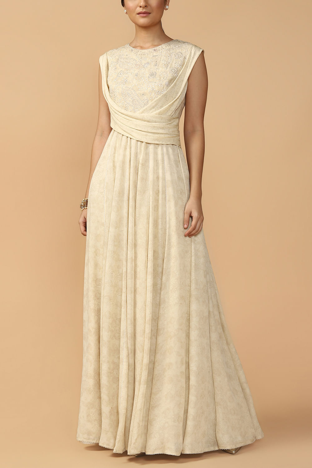 Tarun Tahiliani designs an ivory printed draped anarkali paired with a churidar. Style the look with embroidered capsule clutch.