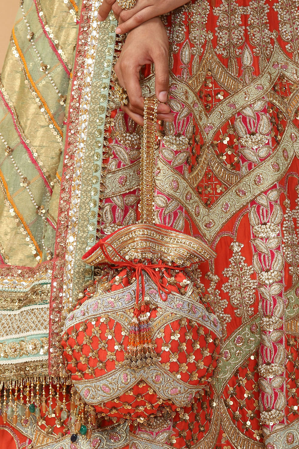 Tarun Tahiliani designs an heirloom-worthy potli bag featuring Swarovskis and beads embellishments. Style it with your traditional saris.
