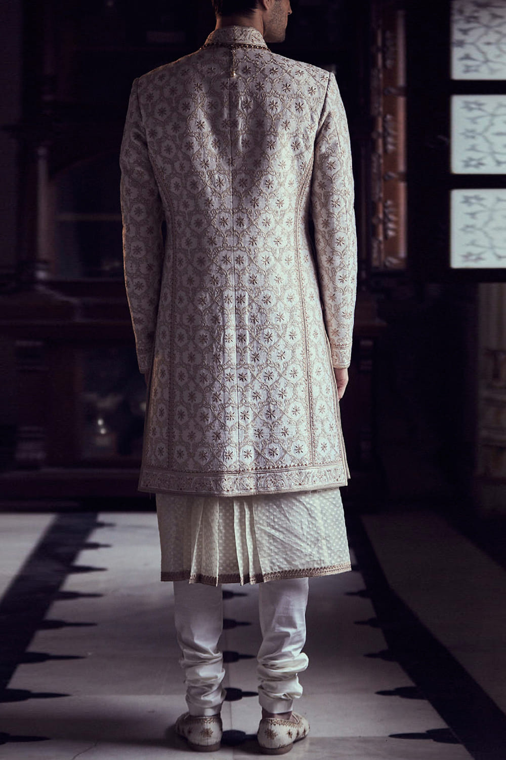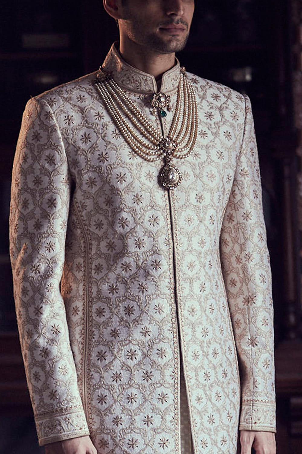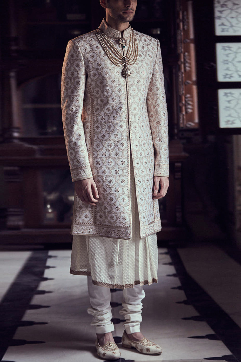 Tarun Tahiliani designs a layered sherwani ensemble made in raw silk fabric with all over intricate floral zal paired with long length kurta and churidar. Style the look with an heirloom necklace.