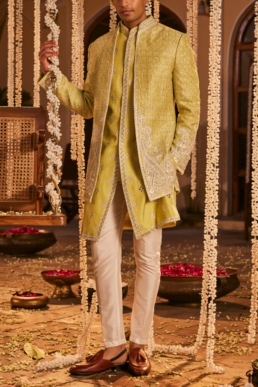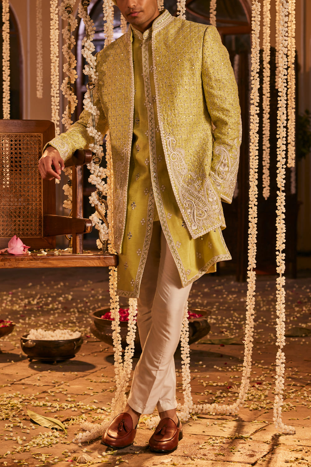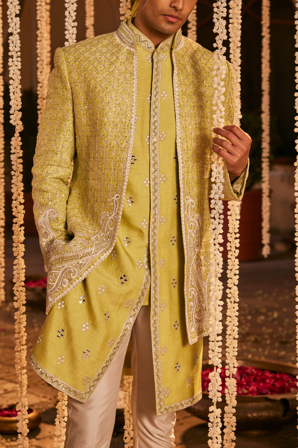 The Royaleum Atelier designs this trendsetting jacket crafted in silk with resham, kasba, stone and bead embroidery detailing, teaming it with a kurta and pants. Style the look with embroidered mules for a sangeet ceremony.