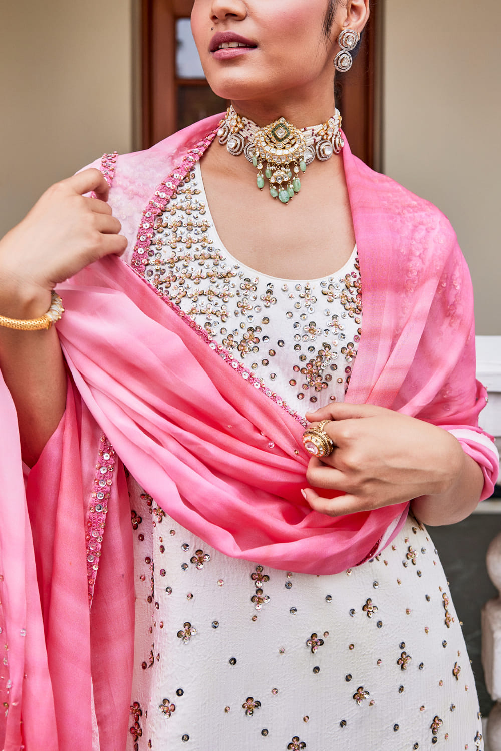 The Royaleum Atelier designs this mesmerising kurta embellished with sequin embroidery detailing in a floral pattern, teamed with silk pants and organza dupatta. Style it with a pair of pearl jhumkas and stackable bangles for an opulent look.