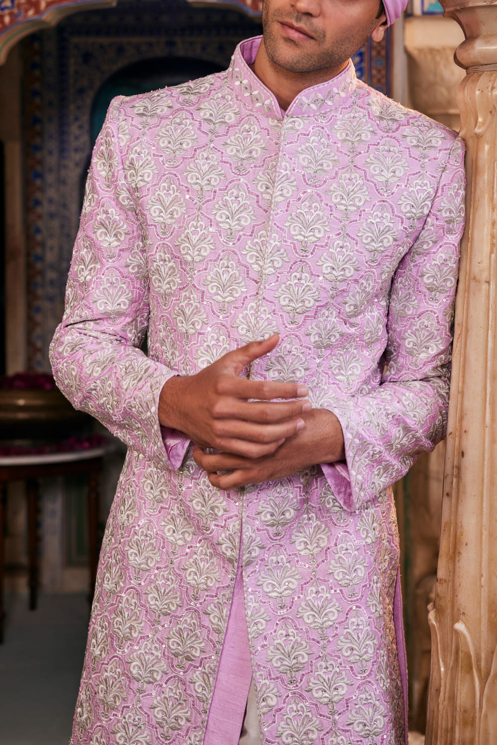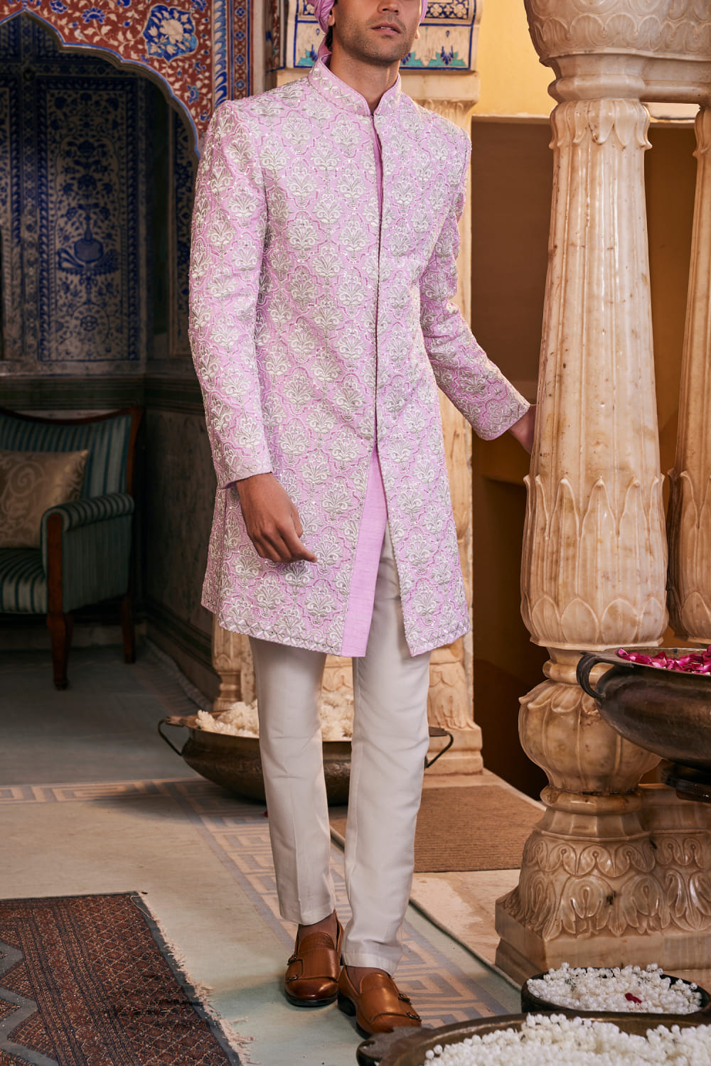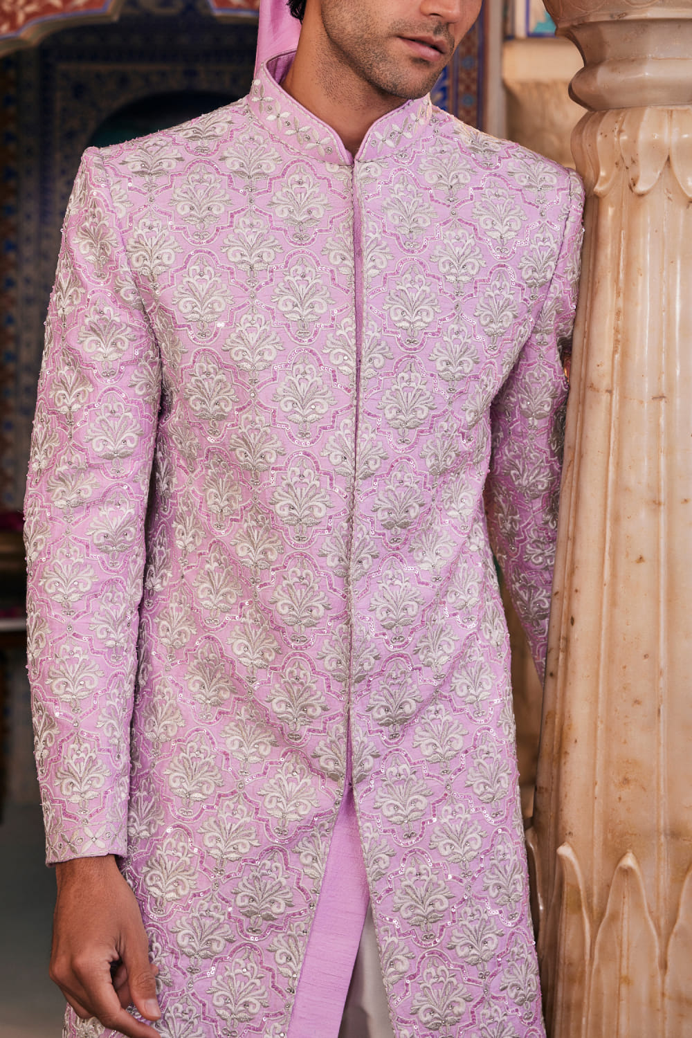 The Royaleum Atelier designs this charismatic sherwani crafted in silk embellished with kasba work, resham, stone and sequin embroidery detailing, teamed with a pair of pants. Style the look with a safa and layered bead necklace for a royal appeal.