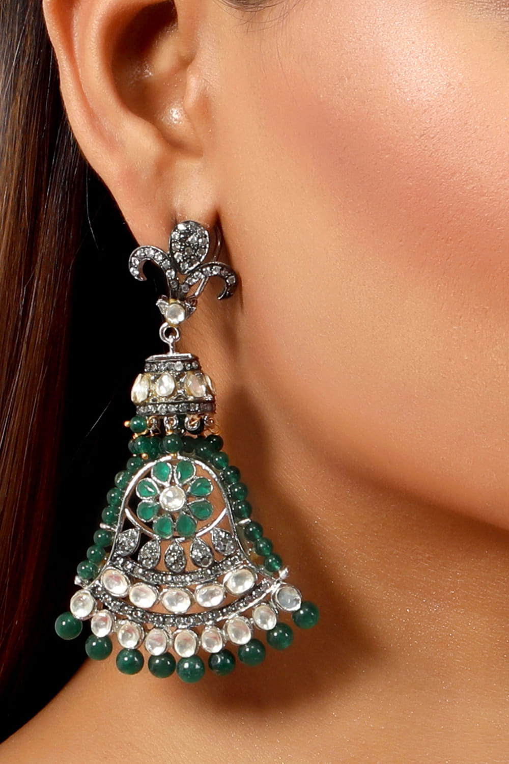 Tizora designs this pair of antique finish earrings with faux diamonds, kundan and synthetic stones. Style them with a cocktail sari to make a statement.