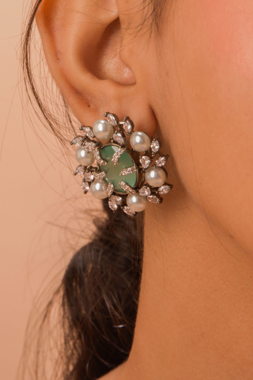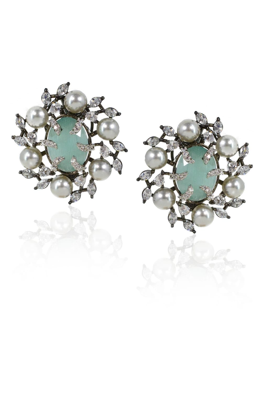 Tizora designs this statement-making pair of studs embraced in 22kt gold plating featuring pearl, faux diamond and stone embellishments in an intricate style. Style them with a printed top and skirt set.