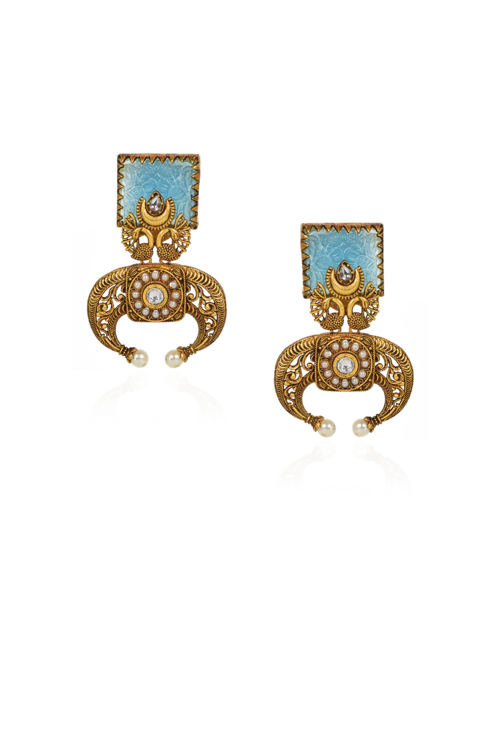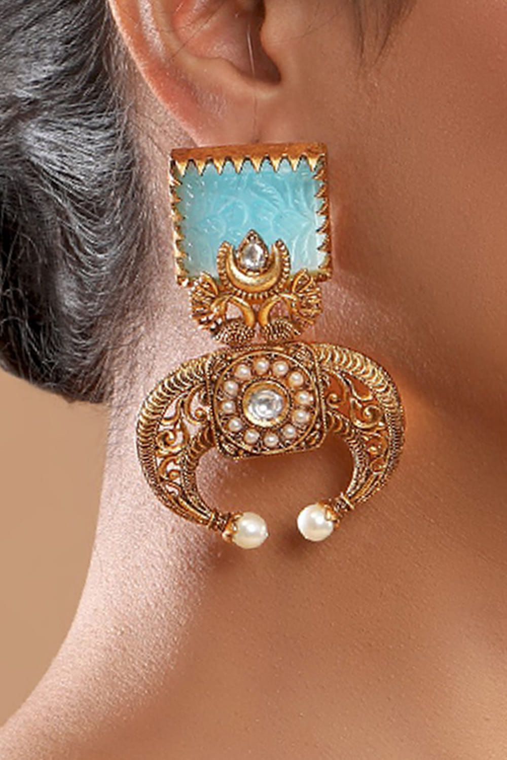 Tizora designs this heirloom-worthy antique pair of earrings embraced in 22kt gold plating studded with blue carved stones, featuring crescent and bird patterns. Adorn them with a concept sari for a modern appeal.