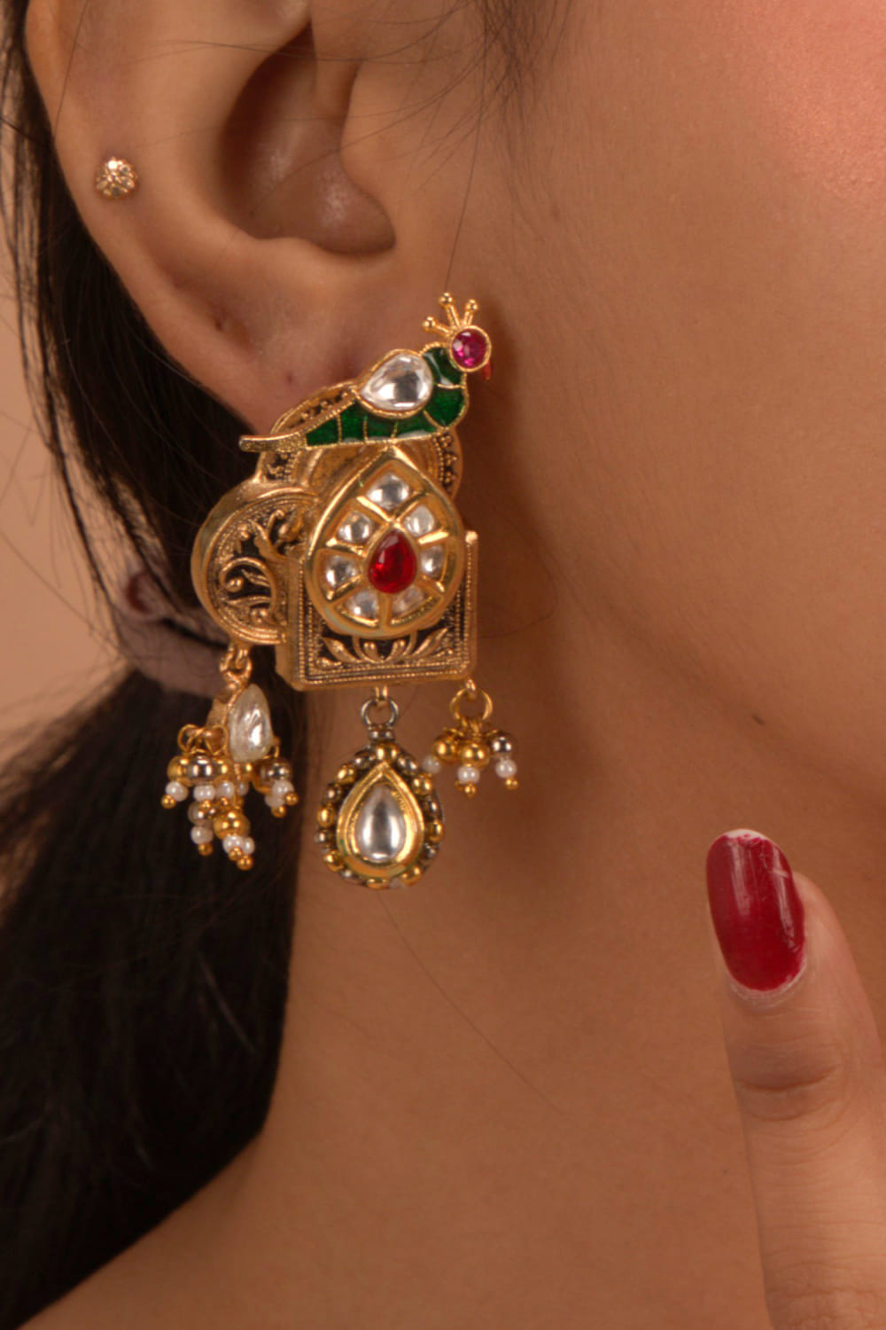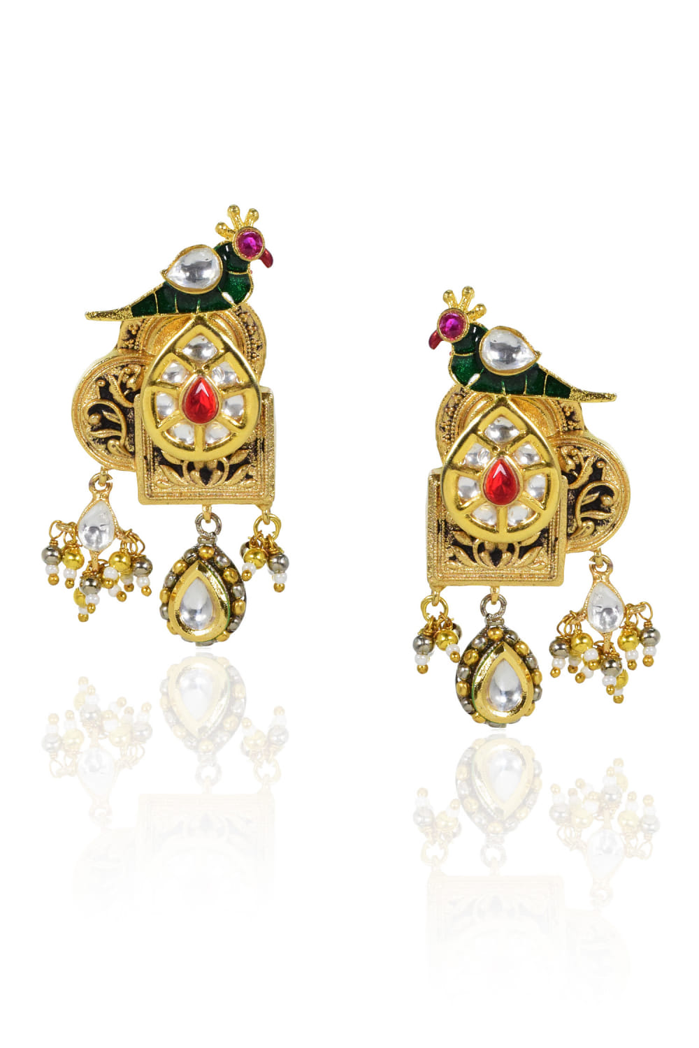 Tizora designs this antique pair of intricate earrings embraced in 22kt gold plating customised with kundan and embellished detailing in a peacock pattern. Adorn them with a banarasi sari for a wedding look.