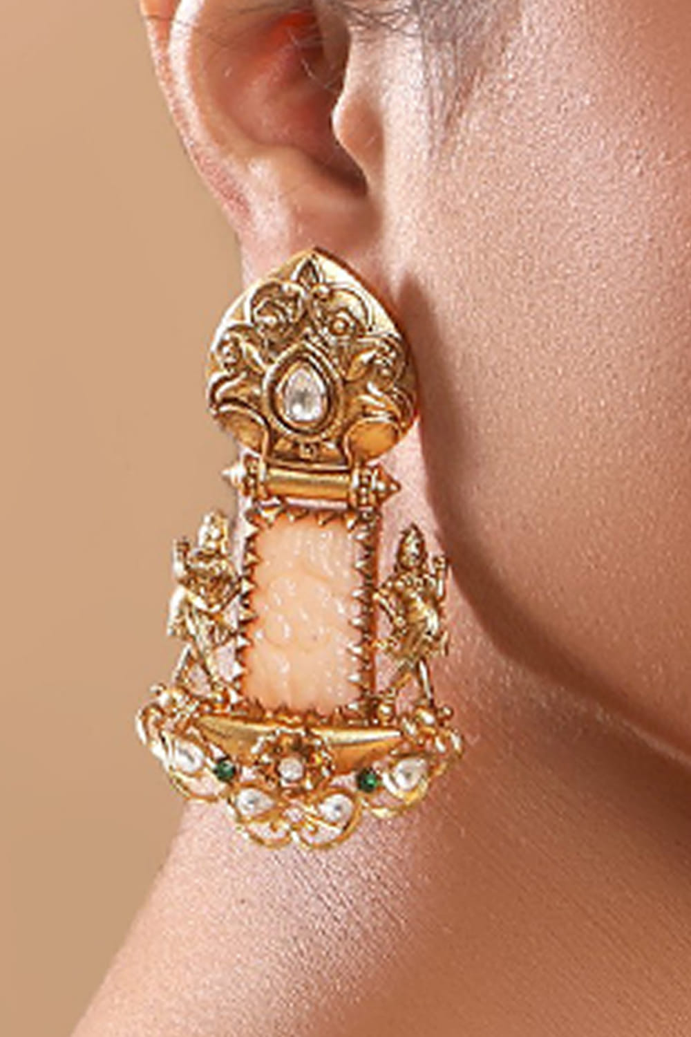 Tizora designs this traditional pair of 22kt gold-plated earrings crafted in an antique style with floral carved stone and kundan detailing. Style them with an anarkali for a Haldi ceremony.