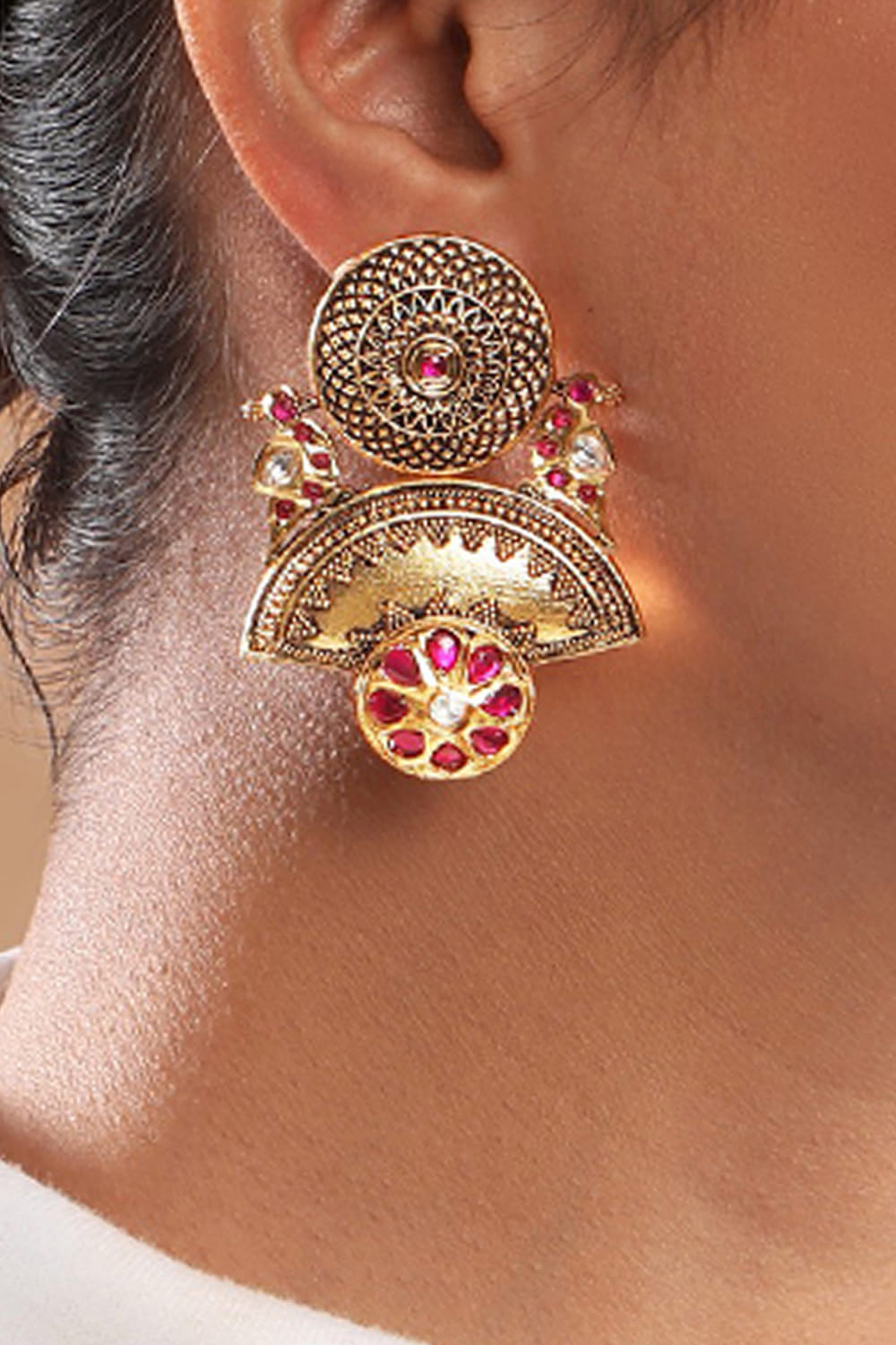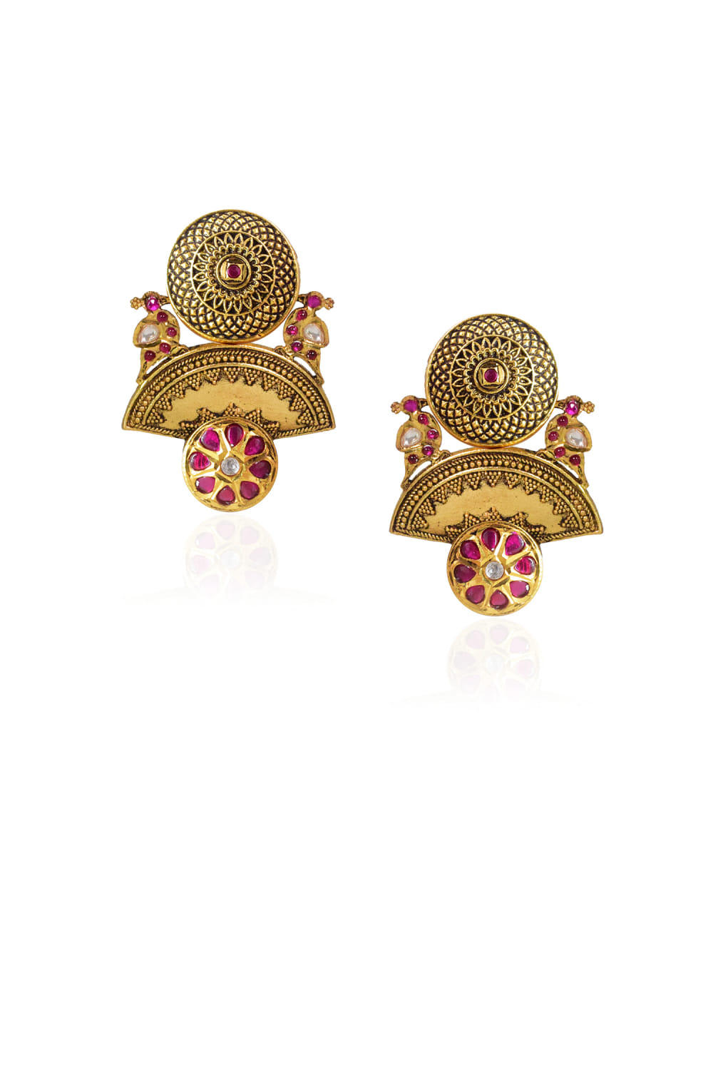Tizora designs this bridal pair of 22kt gold finished antique earrings handcrafted with red stones, featuring mandala, bird and floral patterns. Adorn them with an embroidered lehenga.