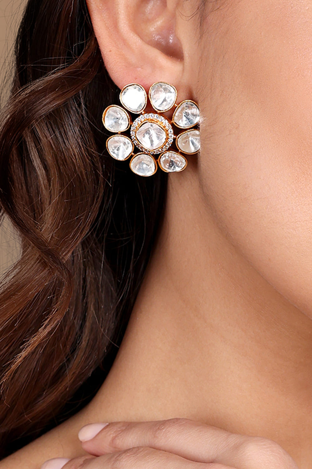 Tizora designs this traditional 22 kt gold plated pair of studs rendered with faux polki in a floral pattern. Style them with a festive kurta set.