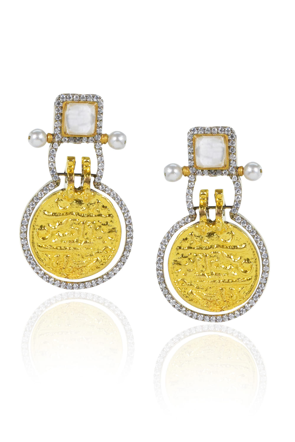 Tizora designs this contemporary pair of earrings finished in 22kt gold plating with faux diamonds, gleaming pearls and kundan embellishments. Style them with a concept sari for a modern appeal.