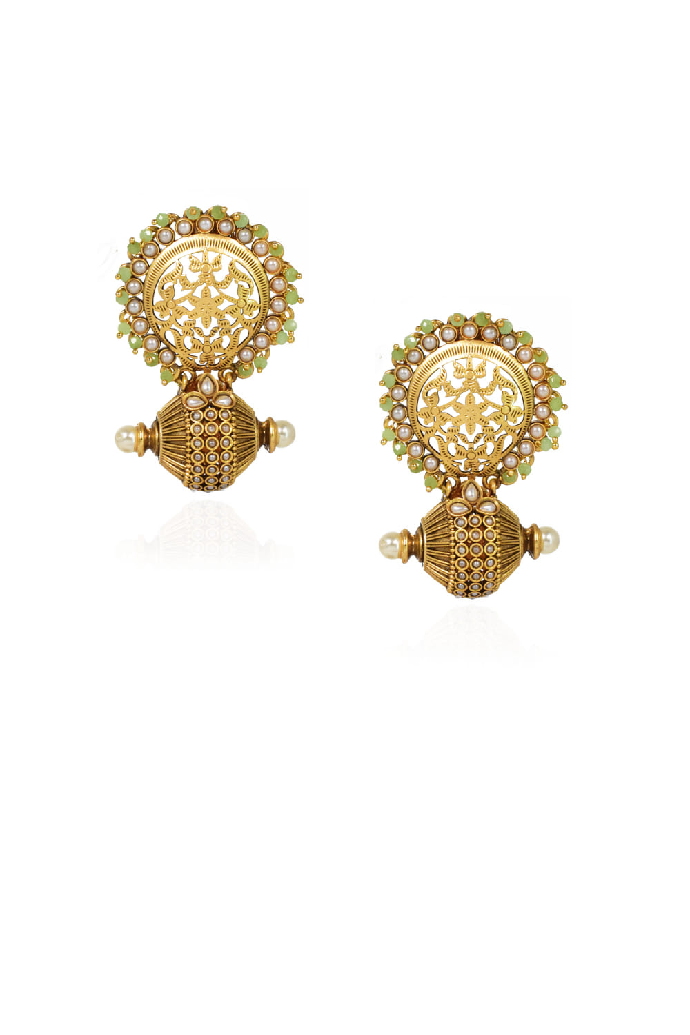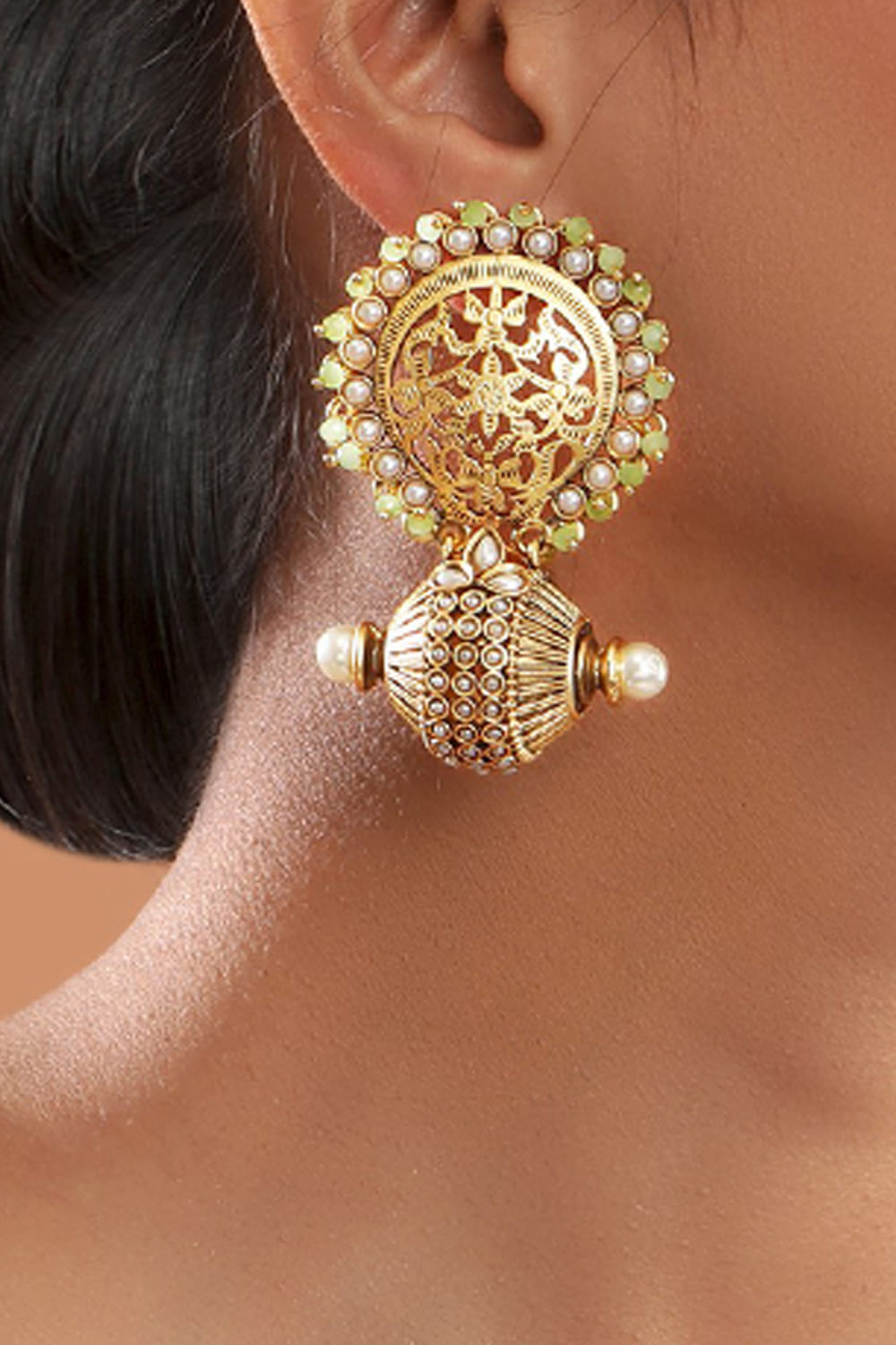 Tizora designs this trousseau-worthy pair of 22kt gold-plated earrings embraced in an antique style handcrafted with pearls and stone beads in jali patterns and dome-shaped bottoms. Adorn them with your bridal wear.