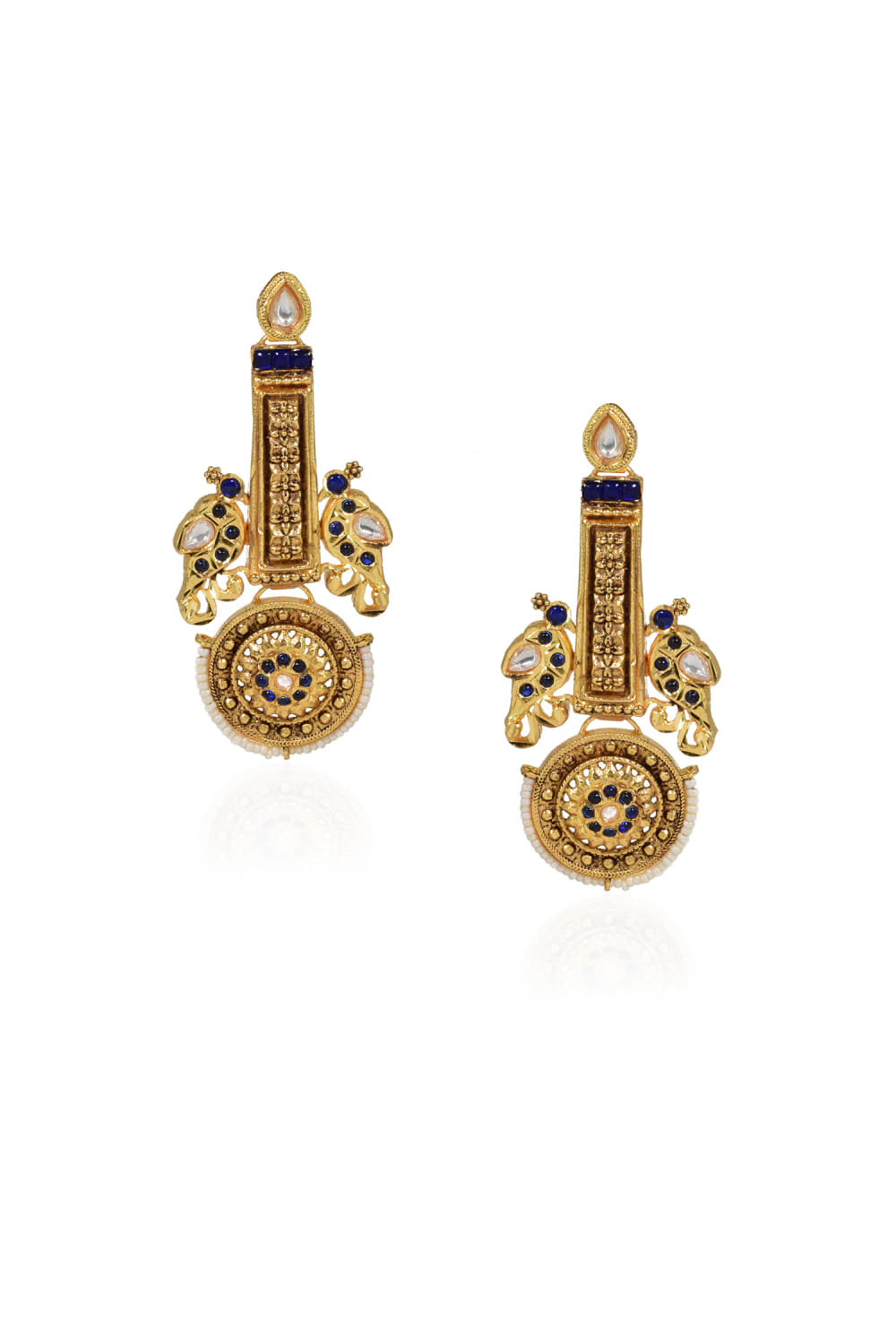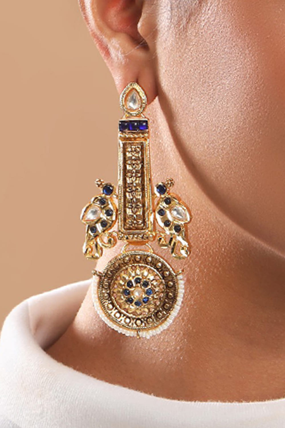 Tizora designs this festive-ready pair of antique earrings in a 22kt gold plating engraved with stone detailing in bird patterns. Style them with your ethnic outfits.