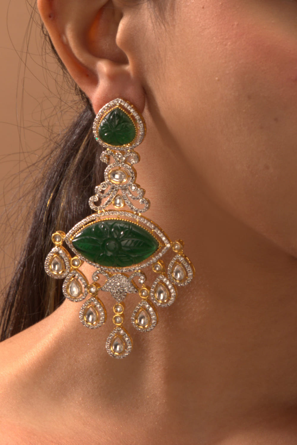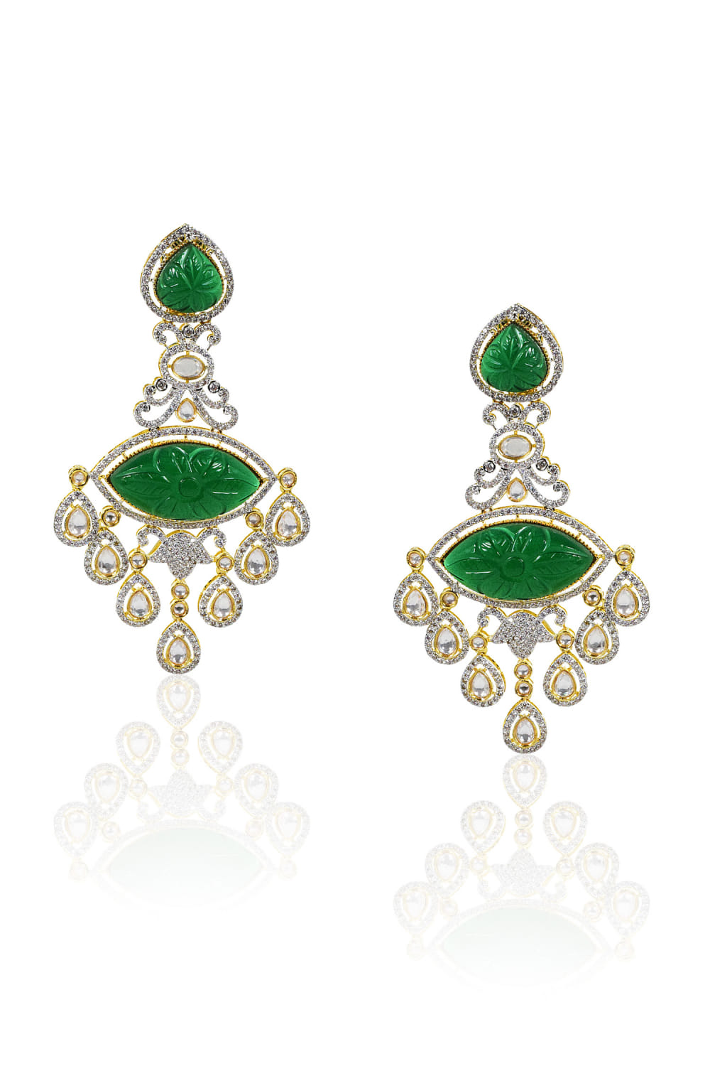Tizora carves this eye-catching pair of chandelier earrings crafted with kundan, faux diamonds and carved stones in 18kt gold plating. Style them with your modern sharara ensemble.
