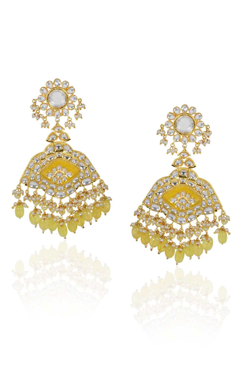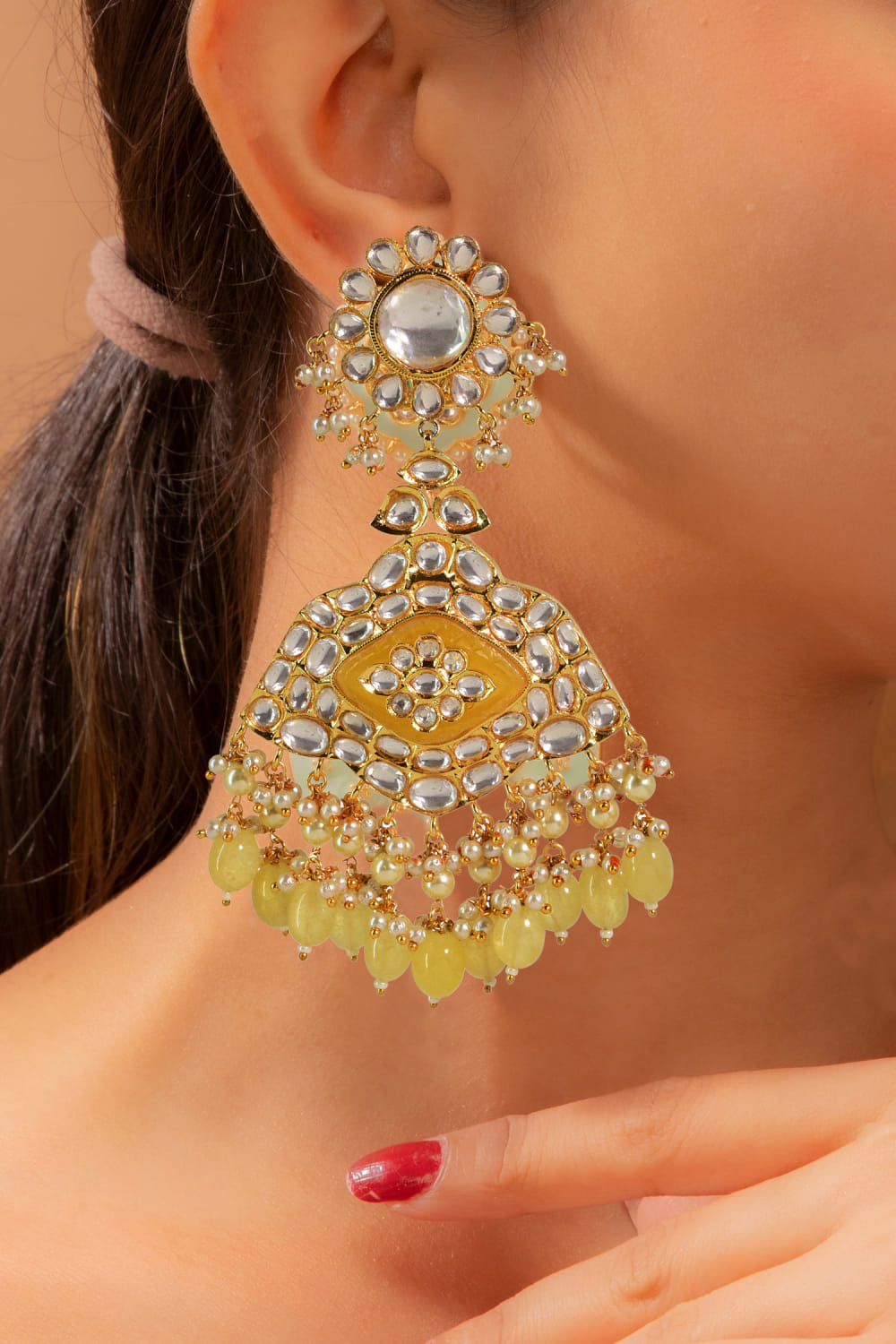 Tizora designs this Haldi ceremony-ready pair of danglers in a 22kt gold finish intricately crafted with kundan, stone and beads. Style them with an anarkali ensemble.