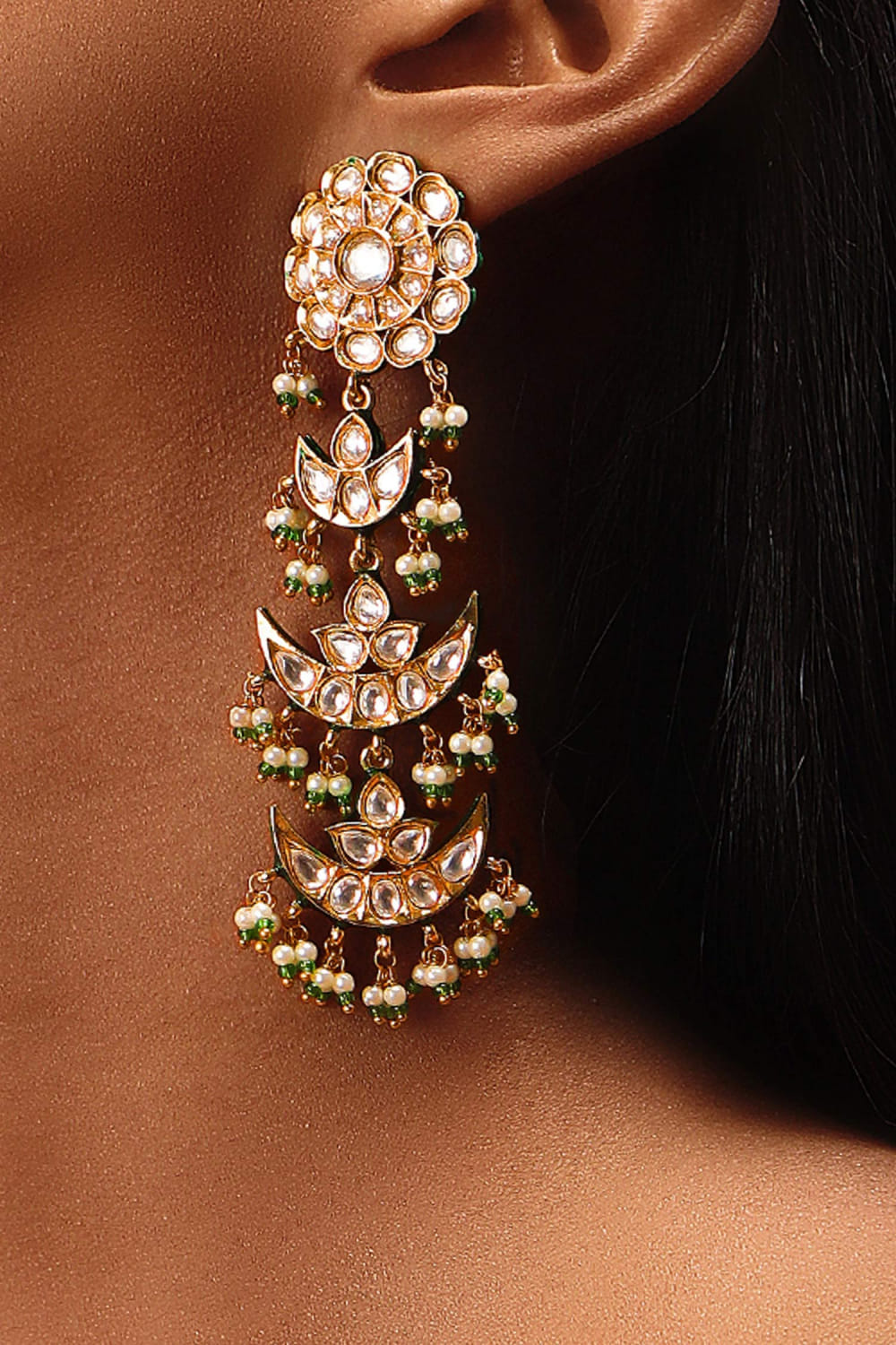 Composition : Kundan , pearls, green beads, and mixed metal Care : Keep away from perfume, water and cosmetics. Store in an airtight pouch only.