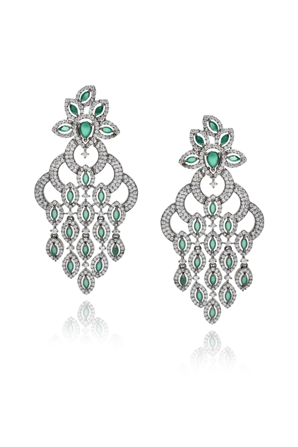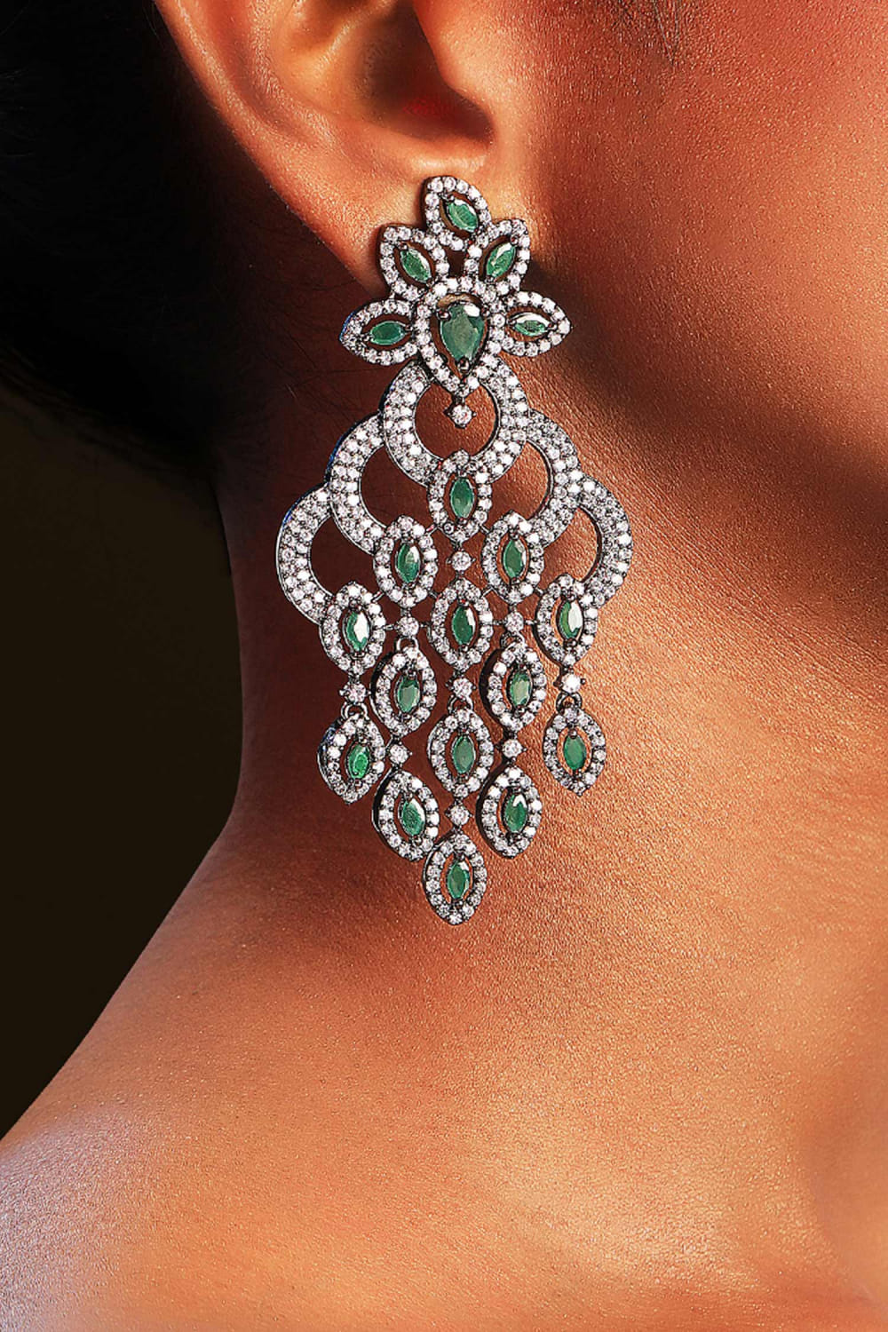 Tizora designs this pair of antique finish earrings studded with green stones and faux diamonds. Style them with an opulent gown.