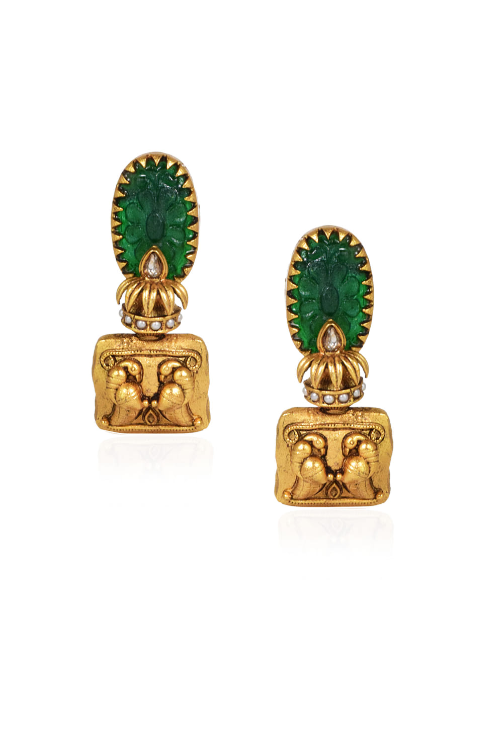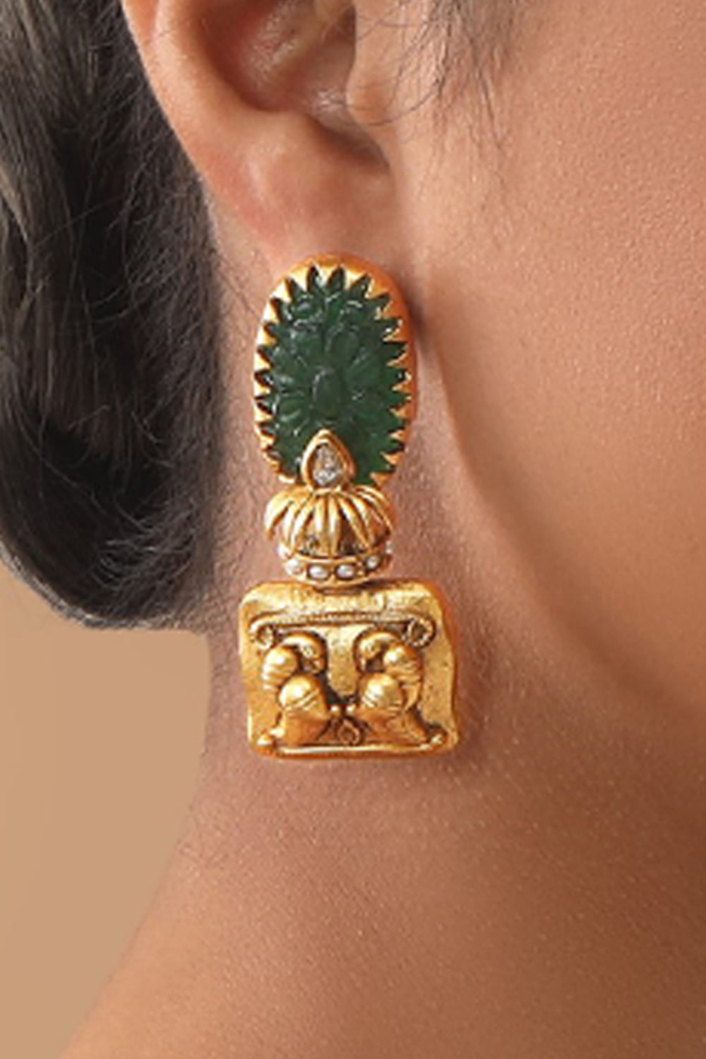 Tizora designs this timeless pair of 22kt gold-plated earrings in an antique style embellished with green floral carved stones and bird patterns. Style them with your embroidered co-ord set.