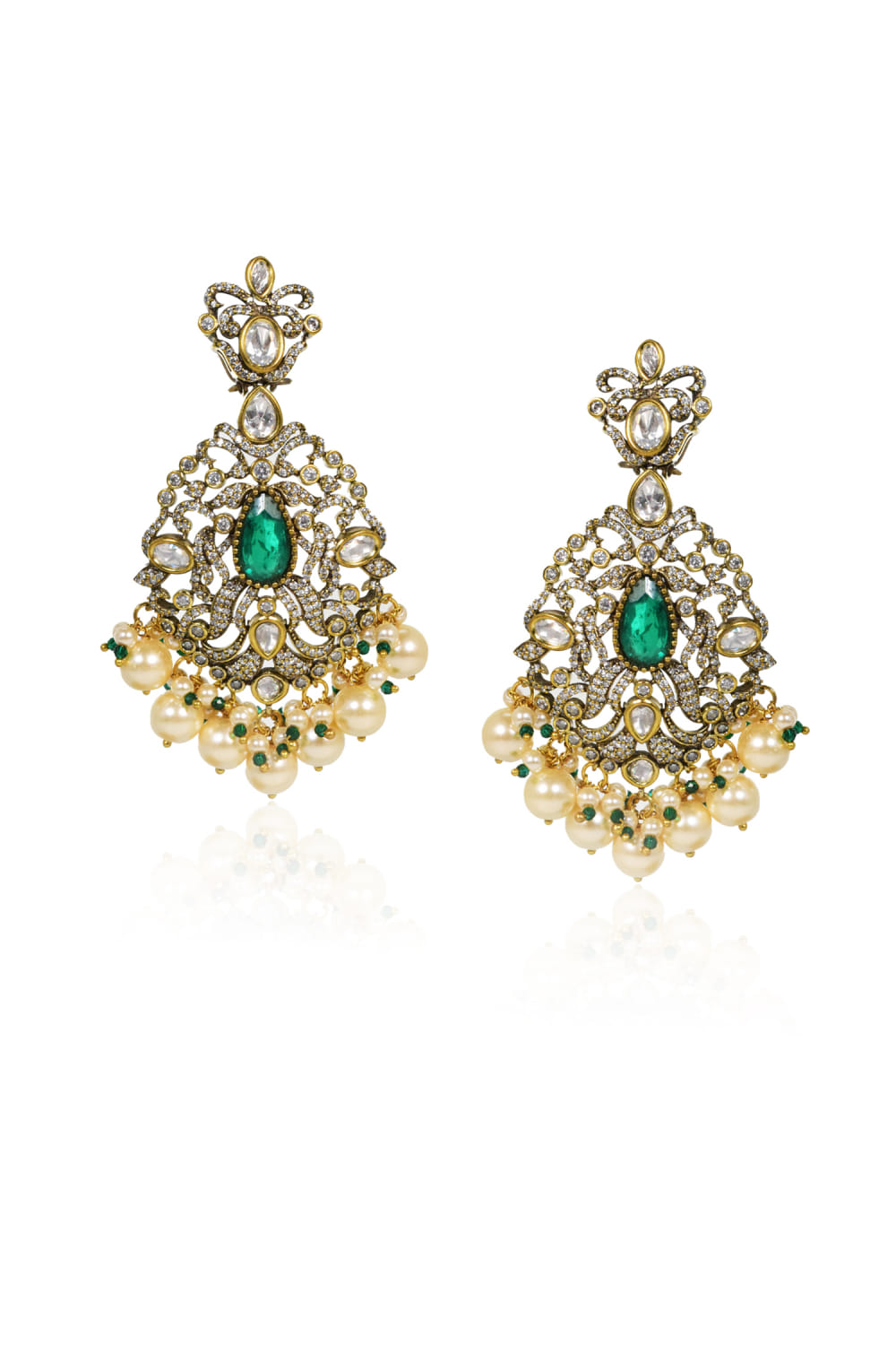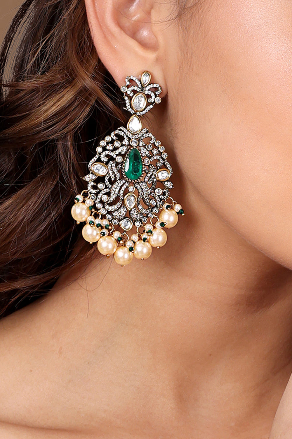 Tizora designs this pair of Victorian-style danglers embellished with faux diamonds, pearl drops and stone detailing in a 22 kt gold plating. Adorn them with a banarasi sari for a cocktail party.