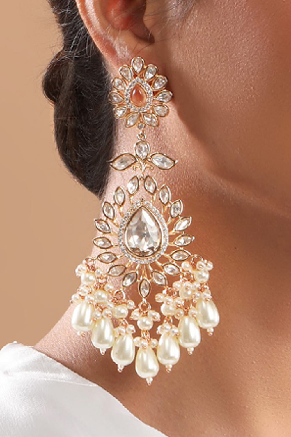 Tizora designs this contemporary pair of danglers customised with kundan and dainty pearl drops. Style them with a gown for a dinner party look.