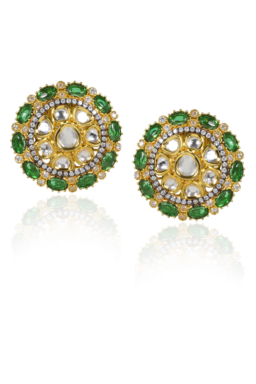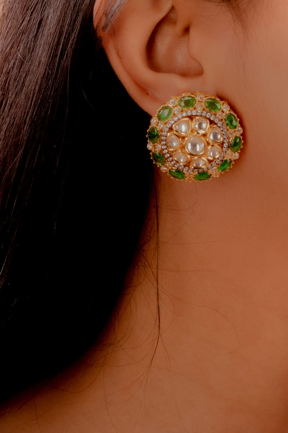 Tizora designs this traditional pair of 22kt gold-plated studs embellished with kundan and stone, featuring intricate floral patterns. Adorn them with your ethnic attire.