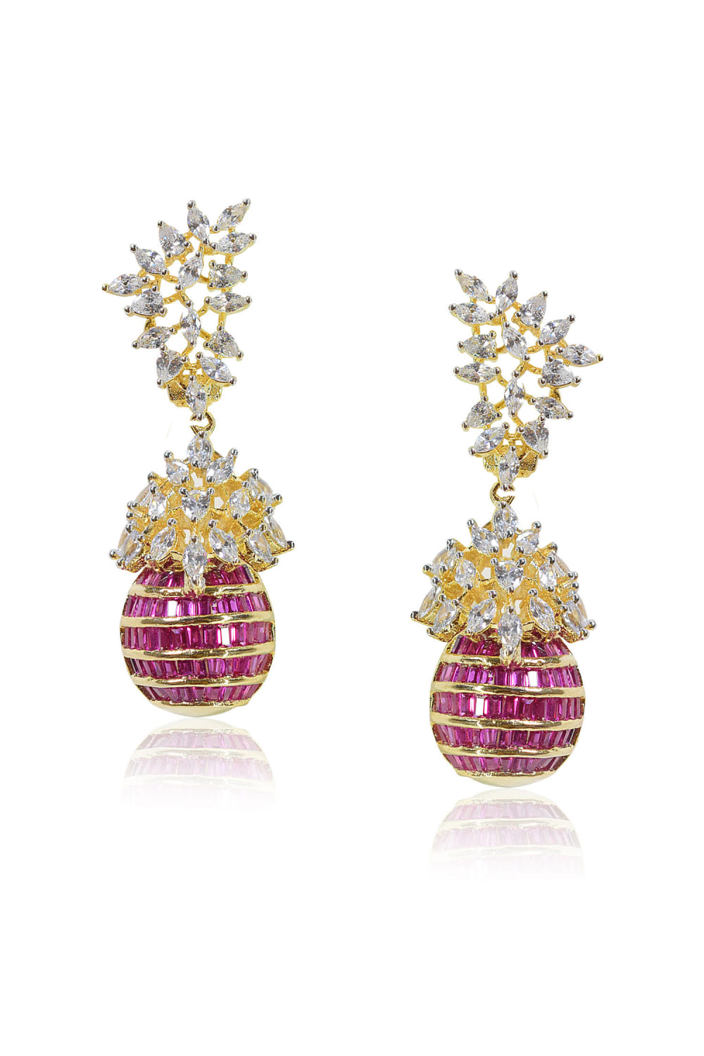 Tizora designs this pair of modern 18kt gold plated earrings customised with red baguette stones and faux stones. Style them with a cocktail sari.