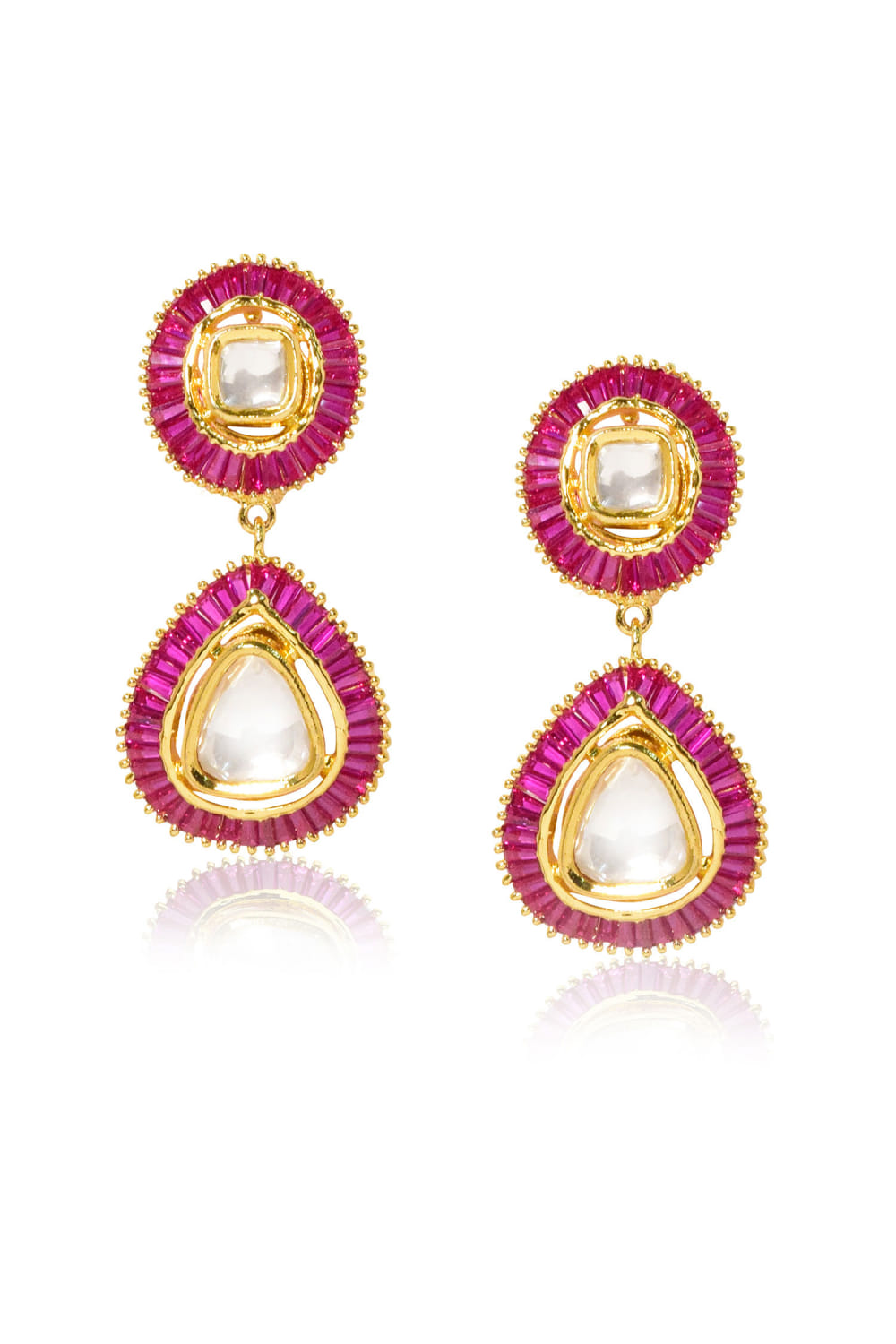 Tizora designs this pair of drop earrings customised in 22kt gold plating, featuring red baguettes. Style them with a festive kurta set.