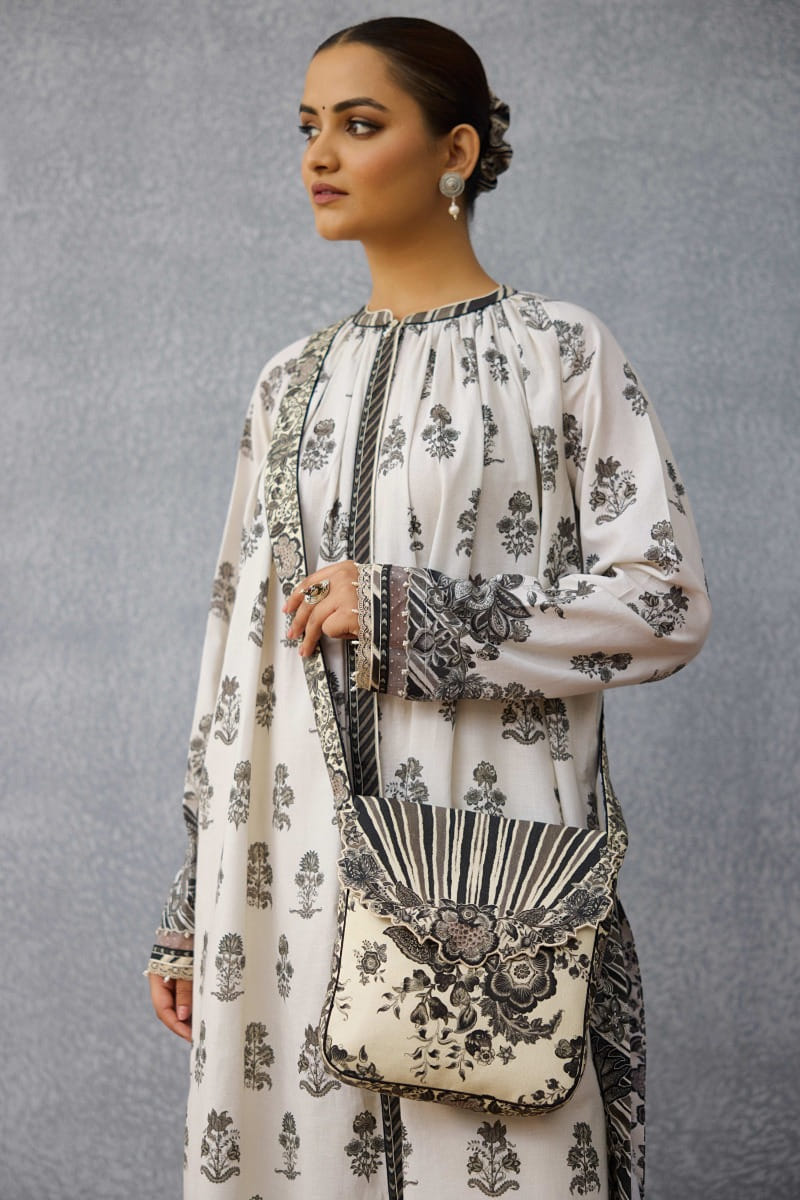 Torani designs this timeless sling bag embraced in duck canvas with Kalamkari-inspired floral chintz and stripe digital print. Style it with a boho-chic crop top and palazzo for a day outing.