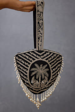 Torani designs this eye-catching bag rendered in slub silk with delicate pearls and dori hand embroidery detailing in tree patterns. Style it with a dhoti set for an occasion. The blouse and saree here are shown for styling purposes only.