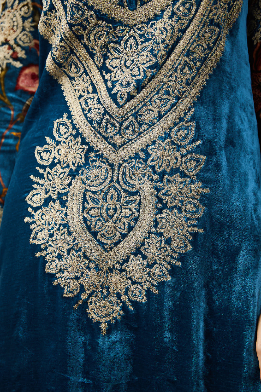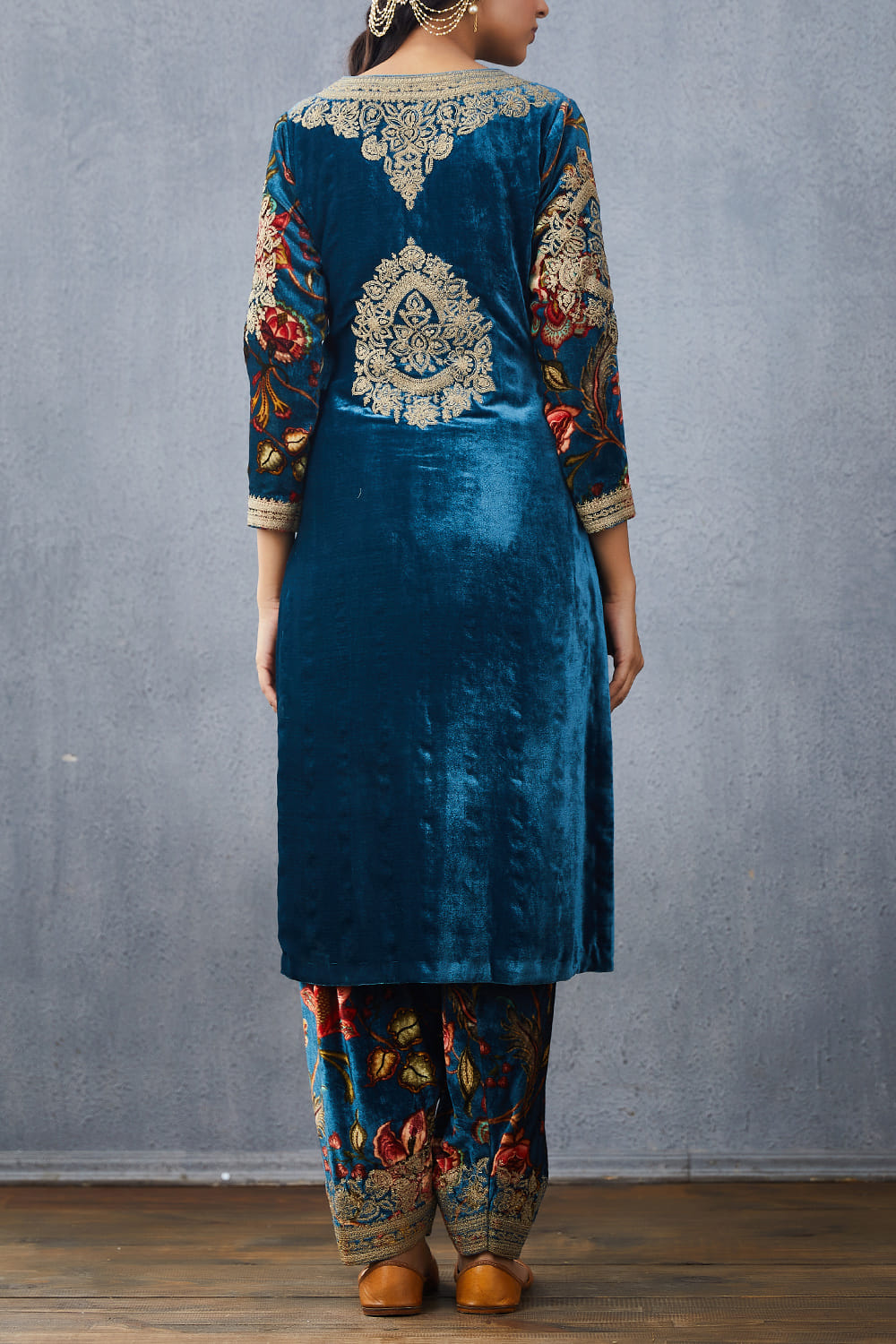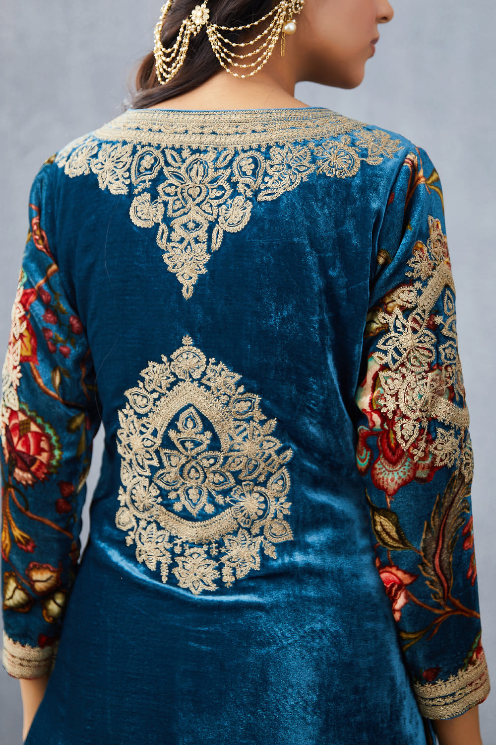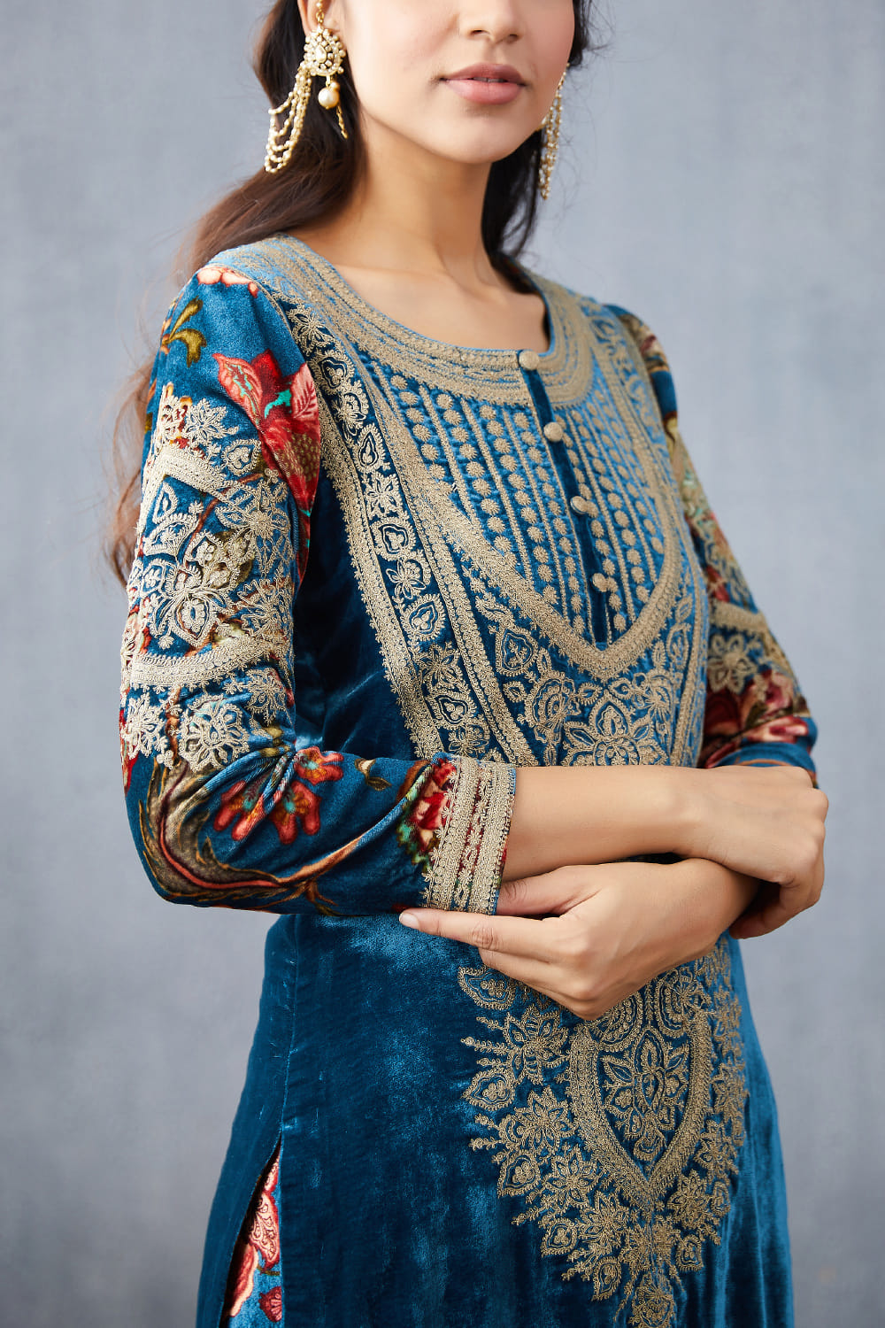 Torani designs this ethereal silk velvet kurta with printed accents on the sleeves and intricately embroidered yoke. Style it with kundan chandbaalis. The pants are shown for styling purpose only.