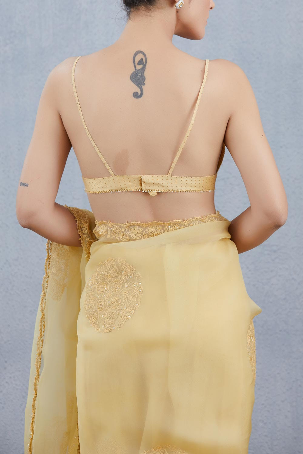 Torani lends a glamorous appeal to this printed blouse with a deep cut neckline. Accentuate the neckline with a choker necklace. The saree here is shown for styling purposes only.