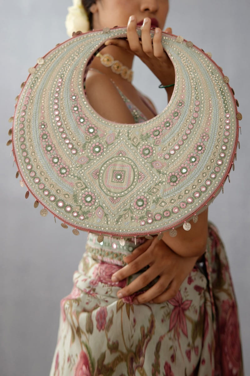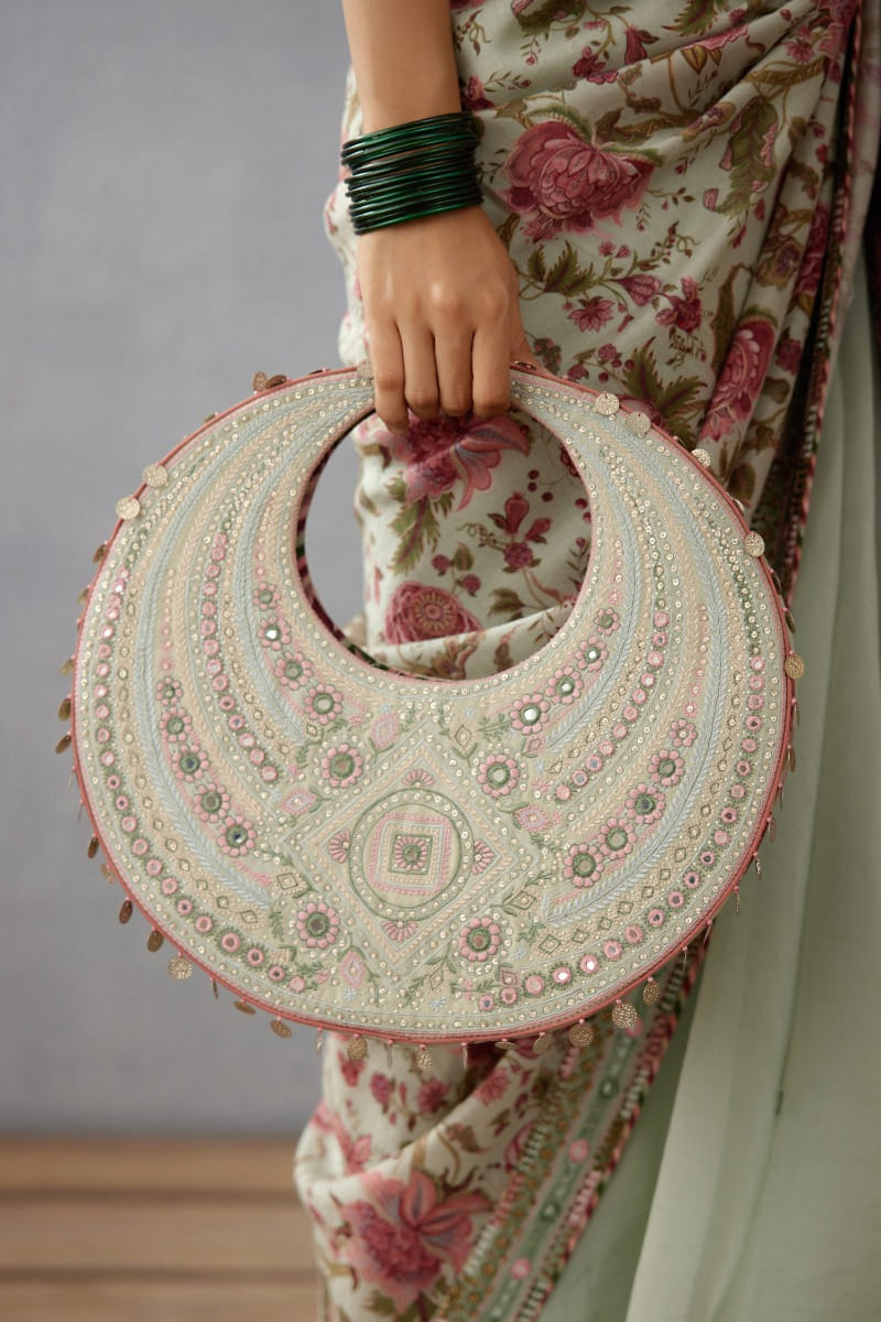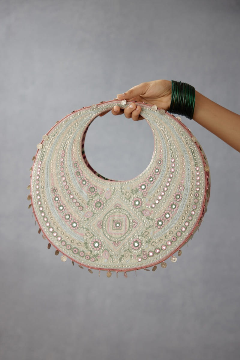 Torani designs this contemporary hobo bag with artsy embroidery and mirror embellishments. Style it with your concept saris and a polki necklace set.