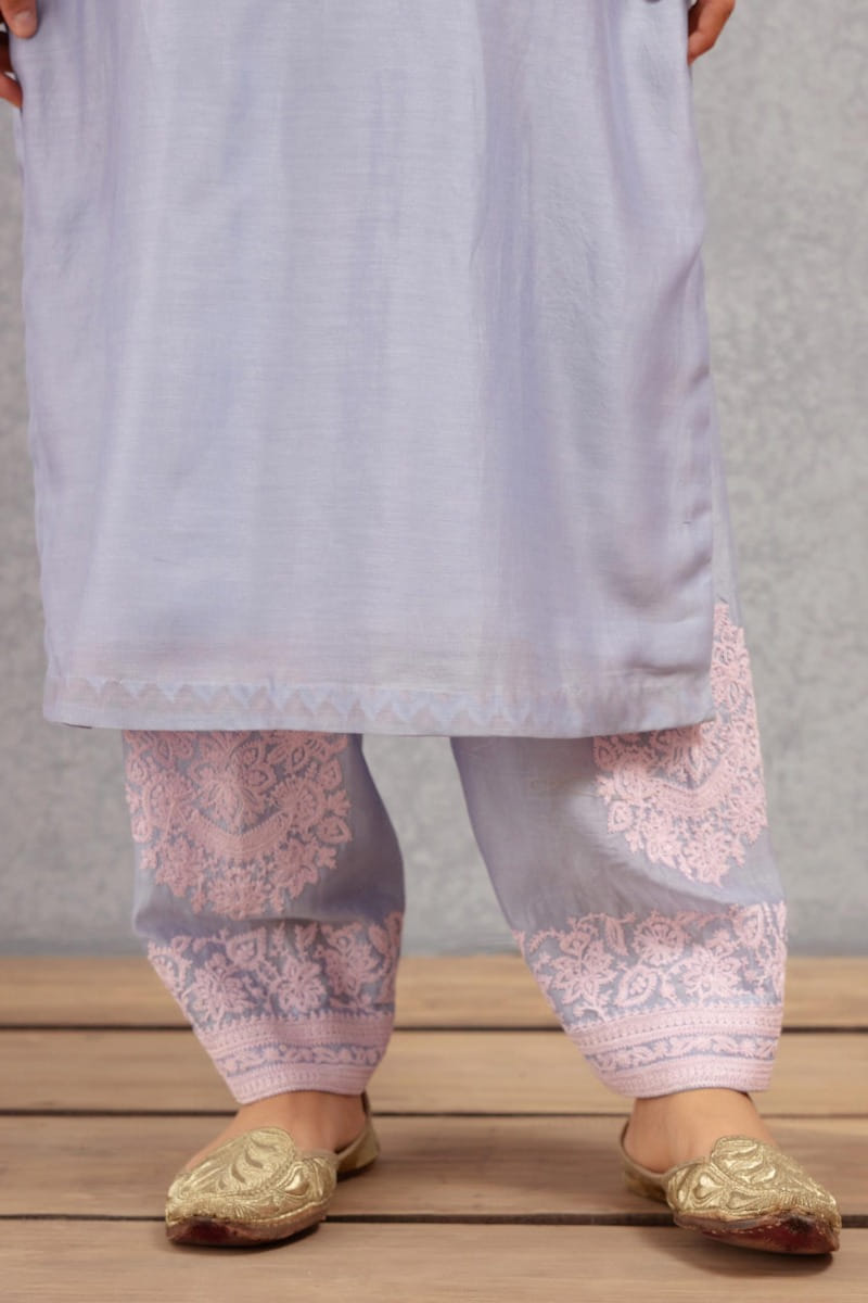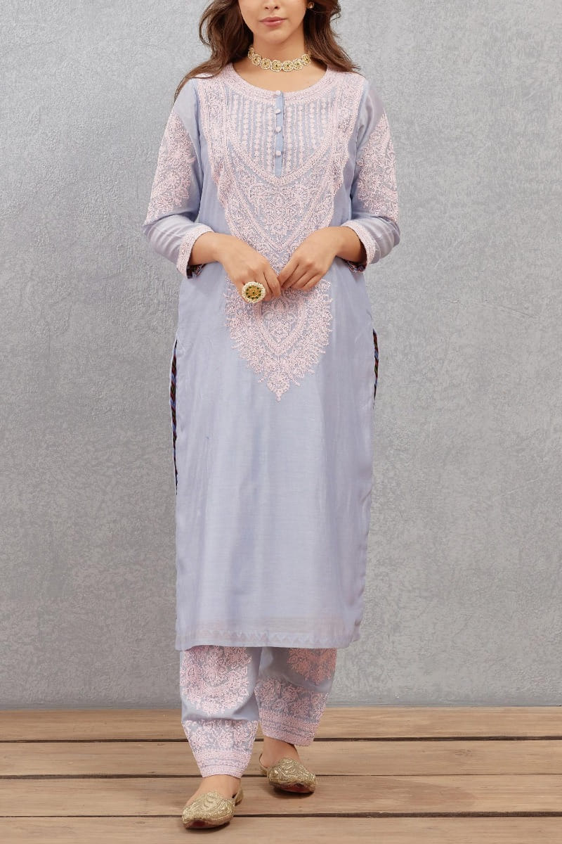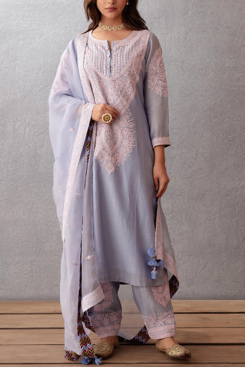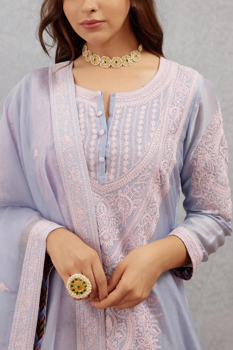 Torani designs this alluring kurta set with pink dori embroidery and shell details on the yoke, complementing the look with an embroidered organza dupatta. Style the look with kolhapuris and gemstone earrings.