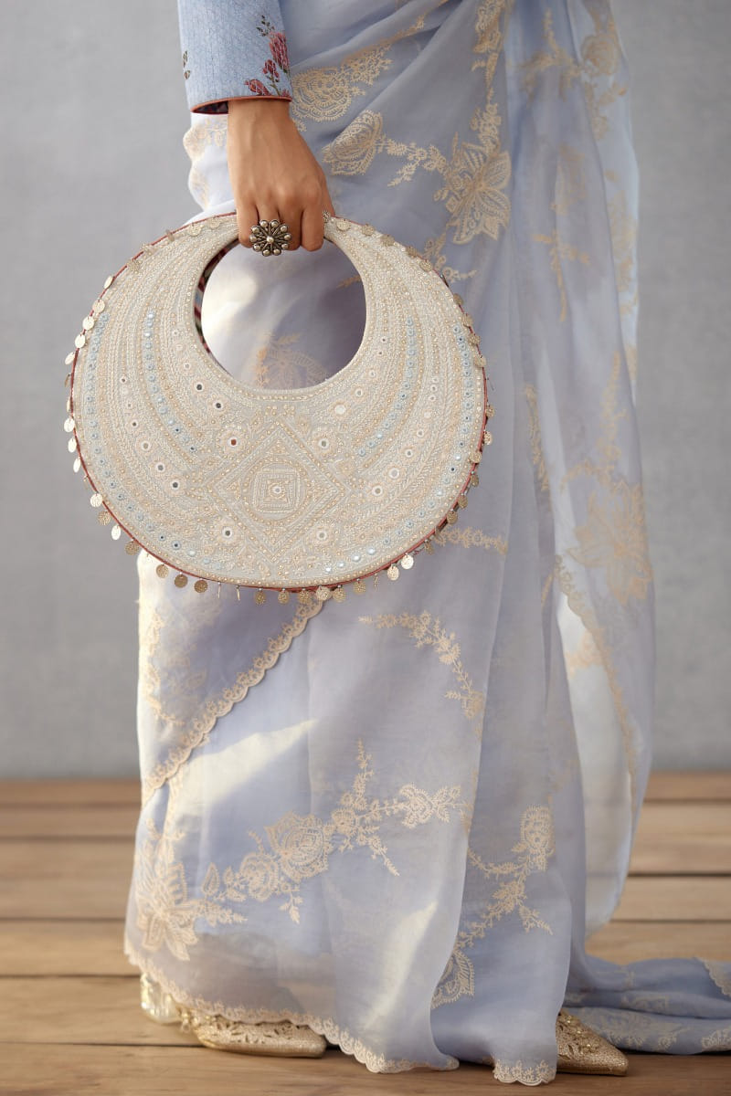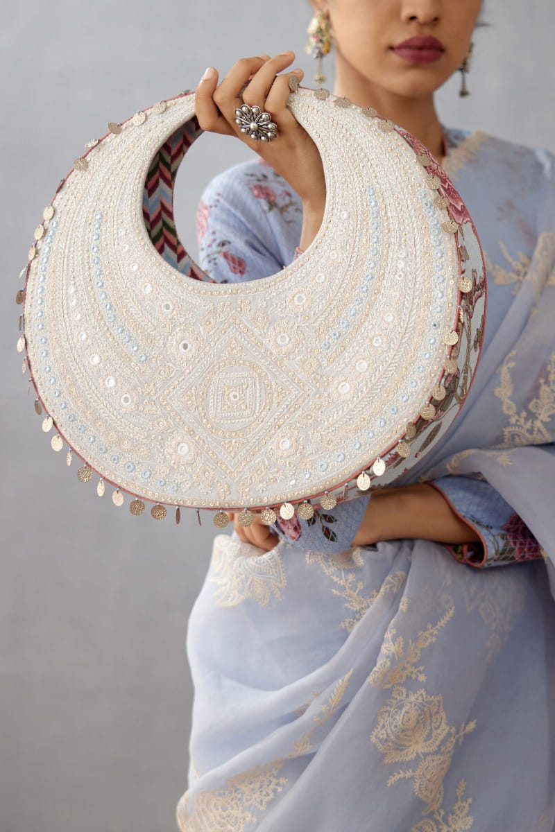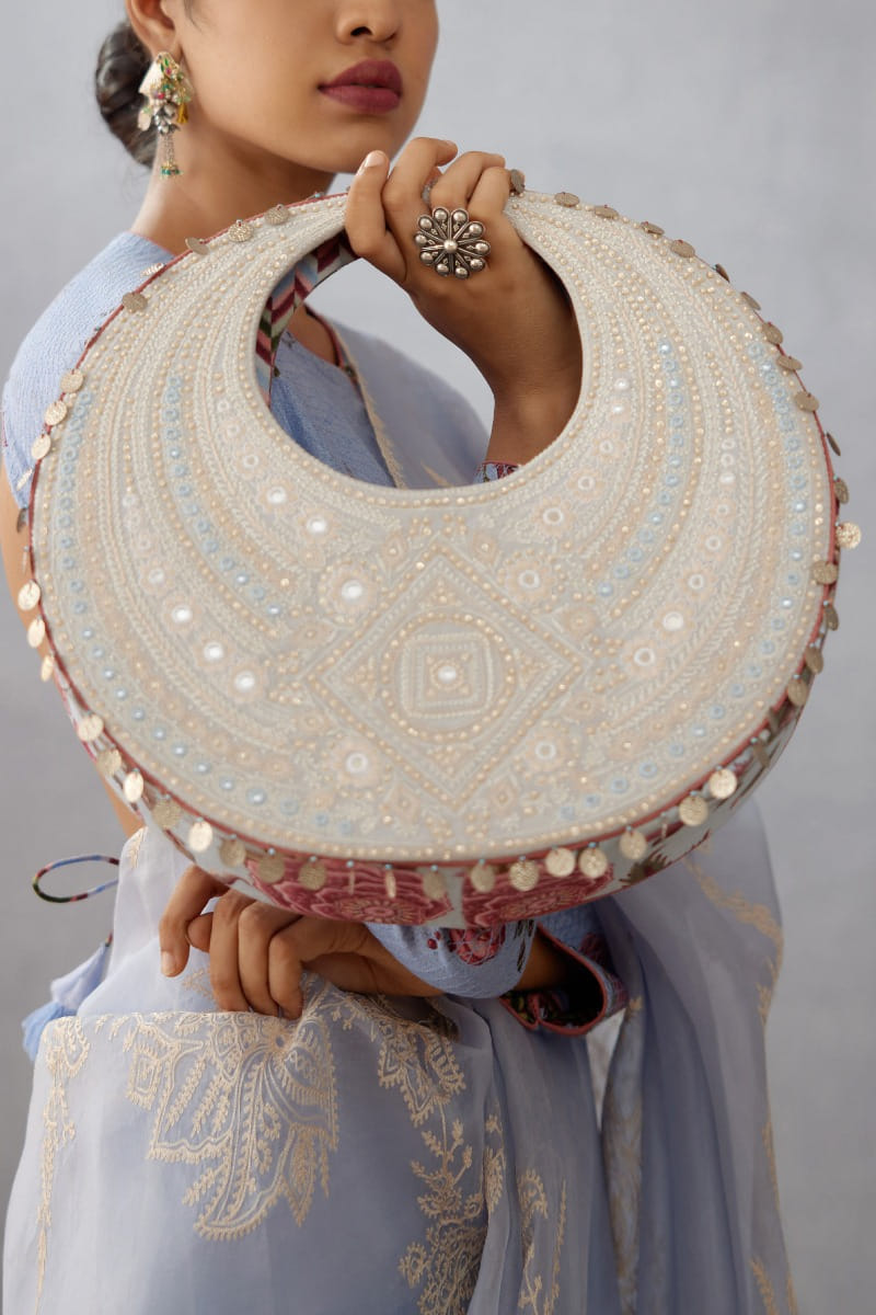 Torani designs this festive-ready hobo bag with artsy embroidery and mirror embellishments. Style it with your organza sari for a modern appeal.