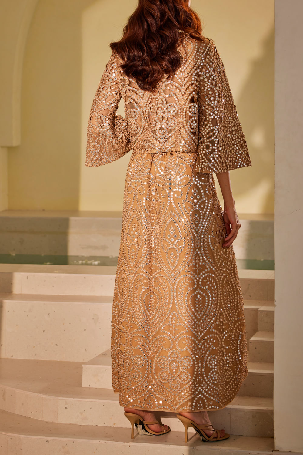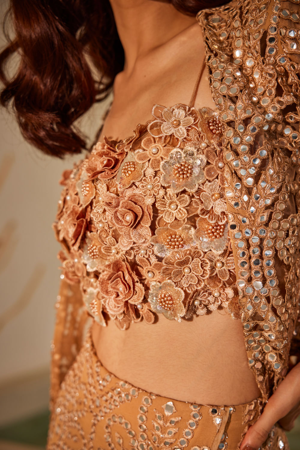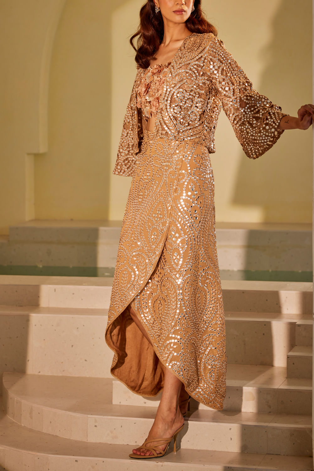 Twenty Nine designs this dazzling crop jacket embellished with jaali work in floating mirror work rendered on georgette fabric. Style it with a bustier and concept sari for a cocktail soiree. The skirt and top here are shown for styling purpose only.