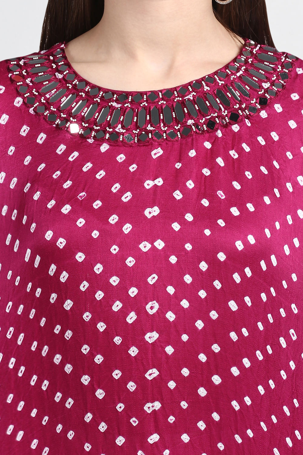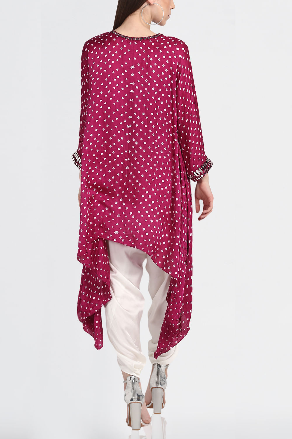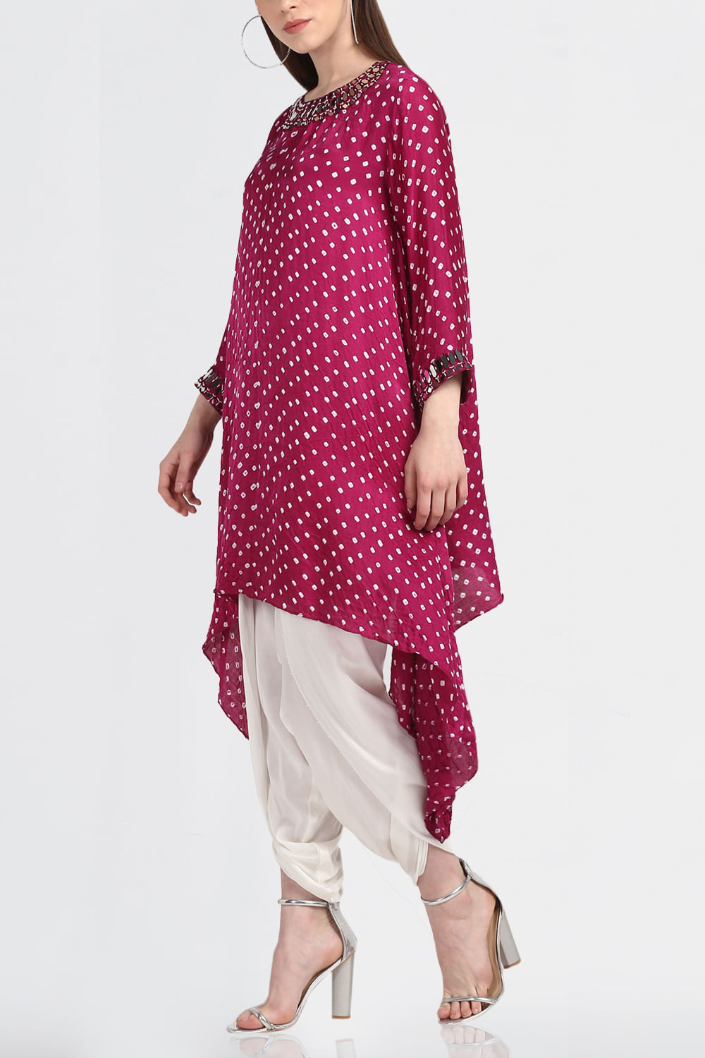 Twenty Nine designs an all-season stylish tunic cut in an asymmetric style with hand embellished mirror work on the bandhani pattern, paired with dhoti pants. Style it with dainty jhumkis.
