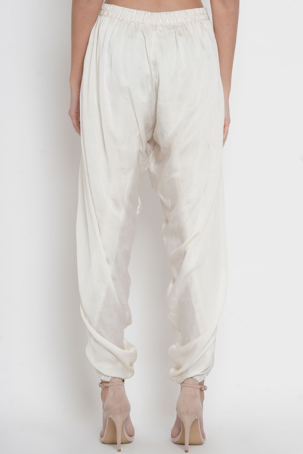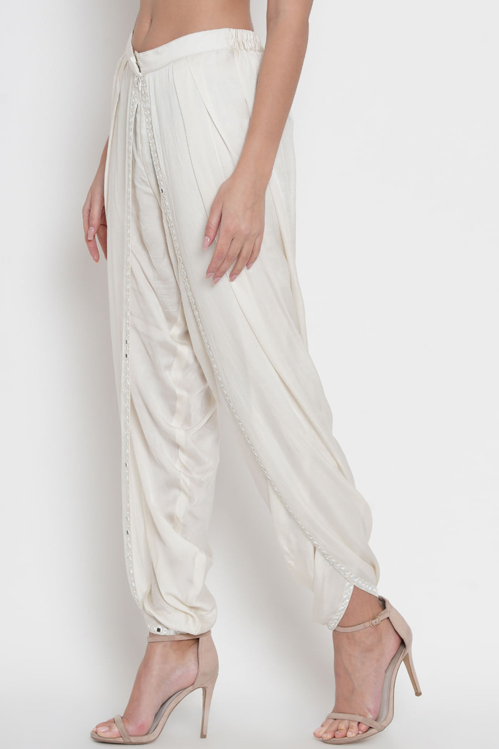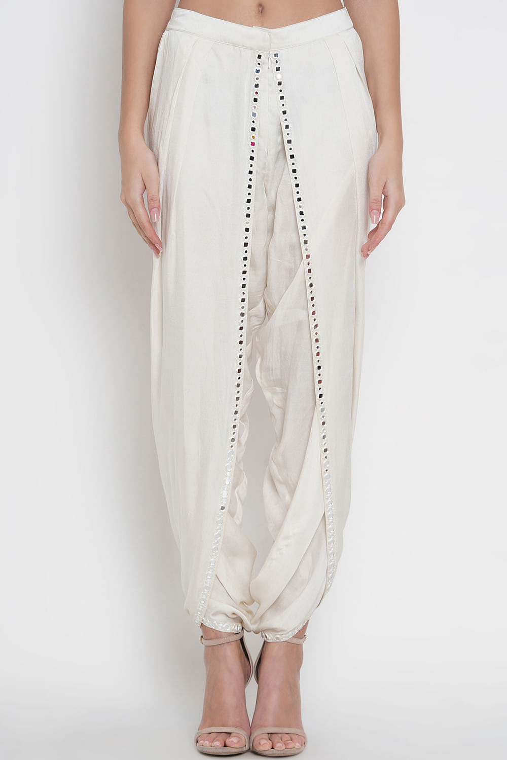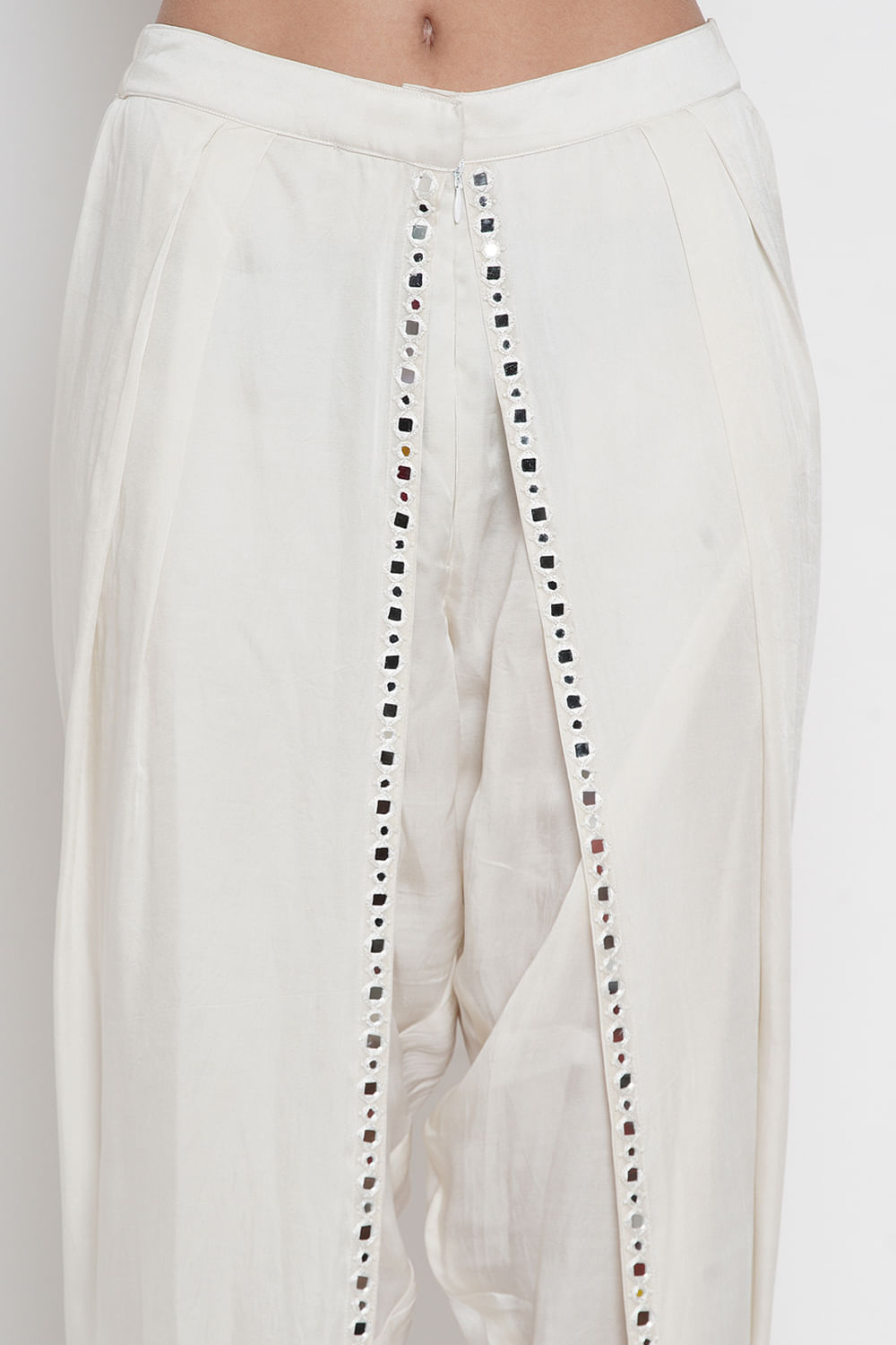 Twenty Nine designs an all-season stylish tunic cut in an asymmetric style with hand embellished mirror work on the bandhani pattern, paired with dhoti pants. Style it with dainty jhumkis.