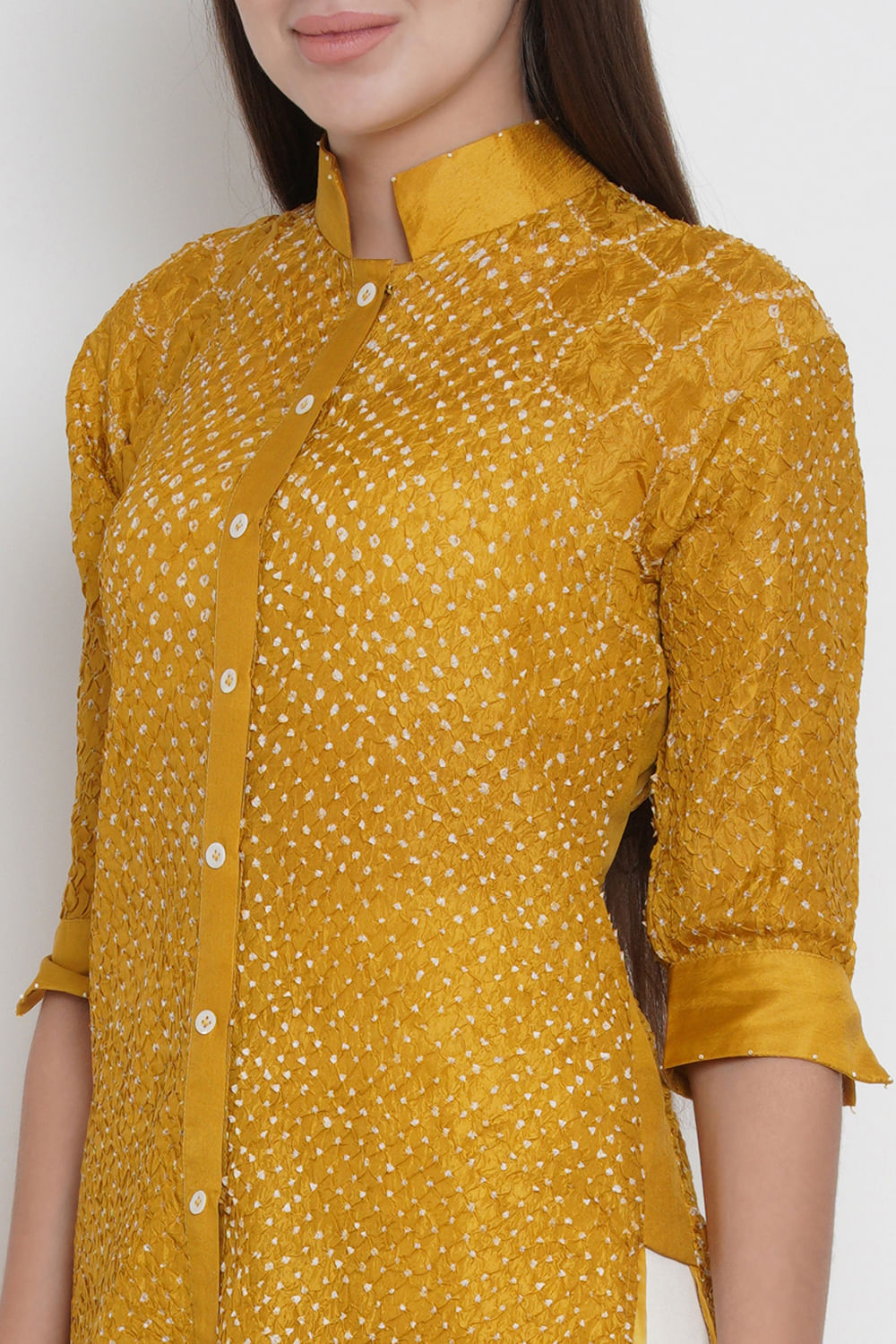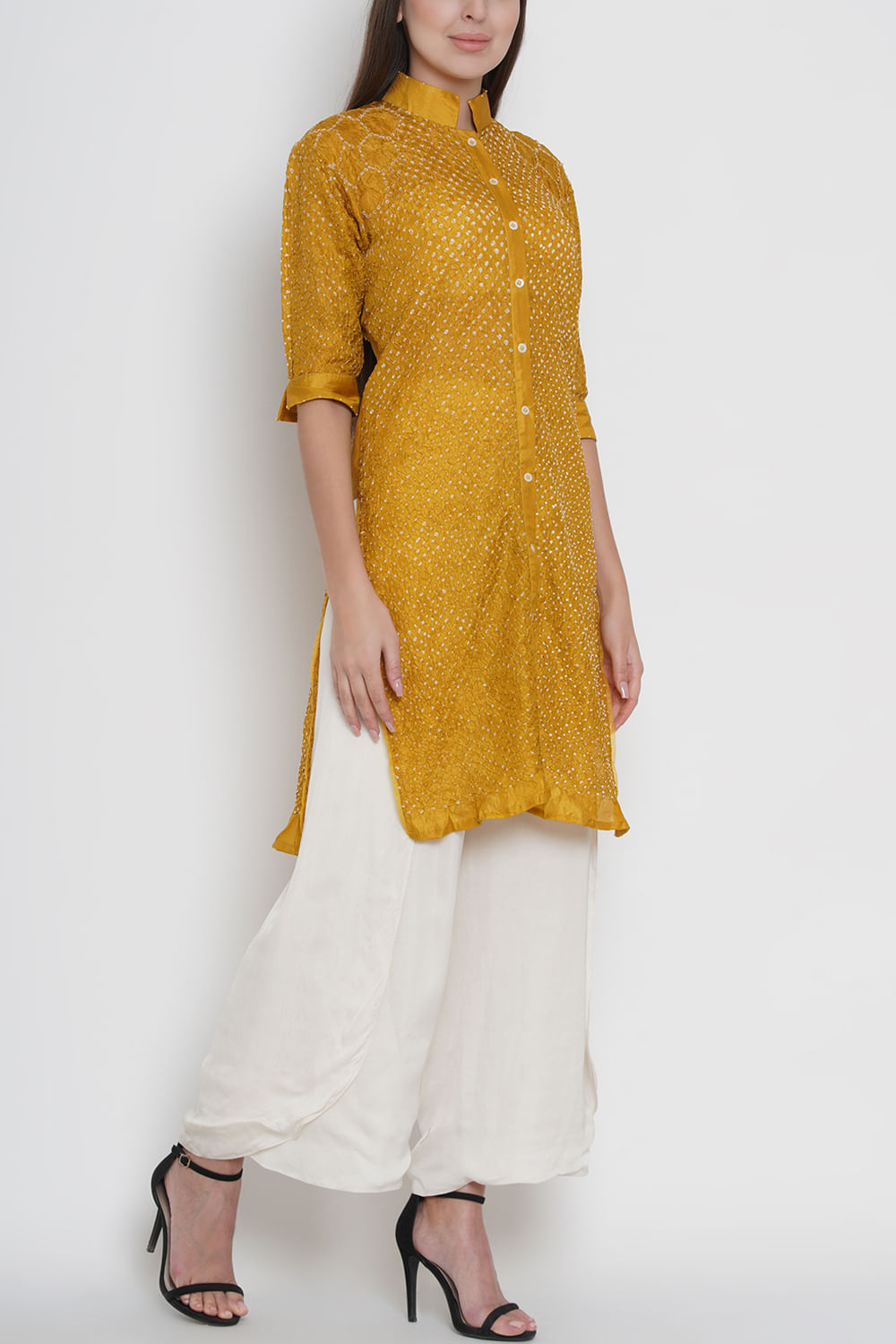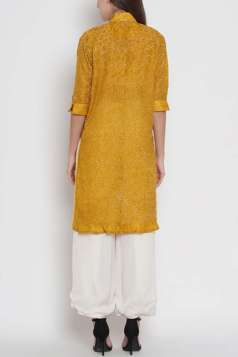 Twenty Nine designs a versatile tunic in crushed bandhani patterned silk with long side slits, paired with wide-legged pants. Style the look with a bohemian handbag.